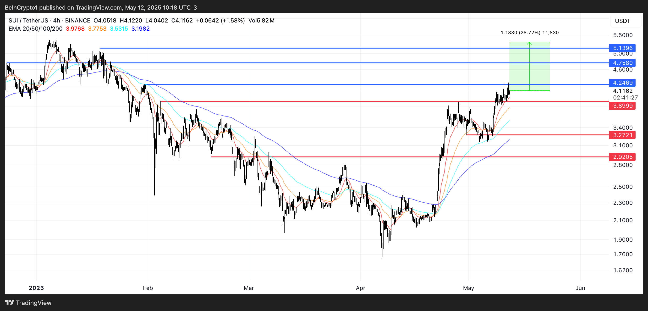 SUI зараз лише на 28,7 % нижче свого історичного максимуму, і якщо висхідний тренд продовжиться, він може незабаром протестувати рівні опору на 4,24 і 4,75 долара — і потенційно перевищити 5,30 долара, щоб досягти нового історичного максимуму.