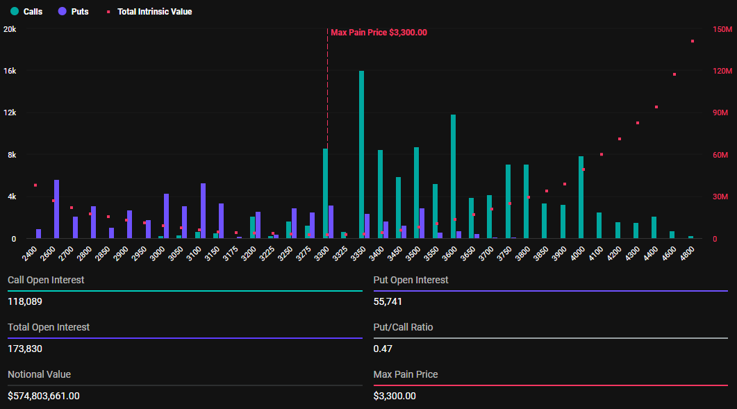Окрім опціонів на Bitcoin, сьогодні закінчуються 173 830 контрактів на Ethereum. Ці опціони, що закінчуються, мають номінальну вартість 574,8 млн USD та коефіцієнт put-to-call 0,47. Максимальна больова точка становить 3 300 USD.