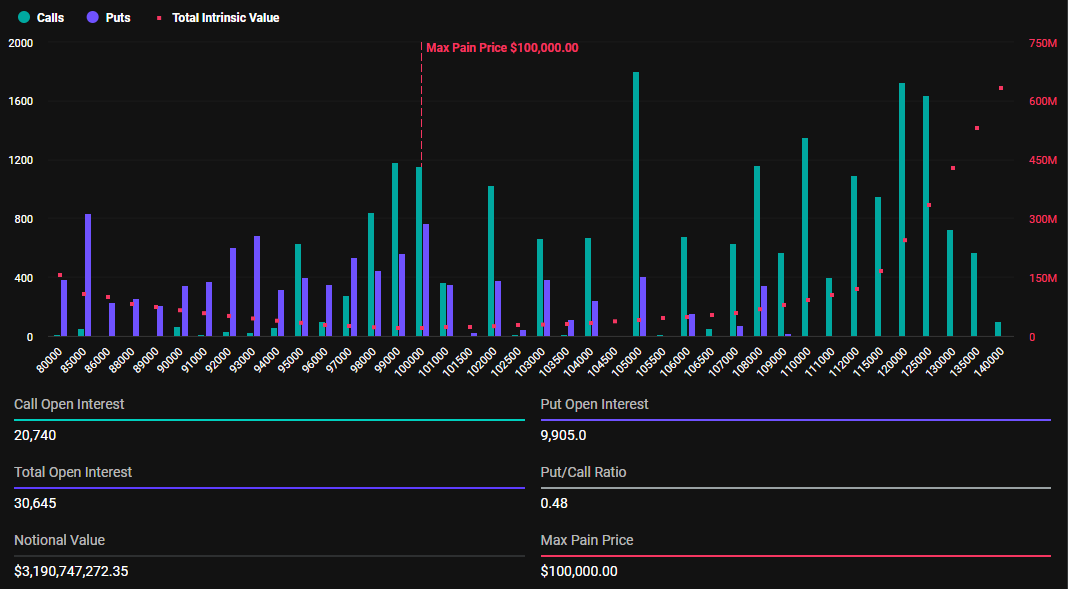 Дані також показують, що максимальна больова точка для цих опціонів, що закінчуються, становить 100 000 USD. У торгівлі криптоопціонами максимальна больова точка – це ціна, за якої більшість контрактів закінчуються без вартості. Тут актив спричинить найбільші фінансові втрати для власників.