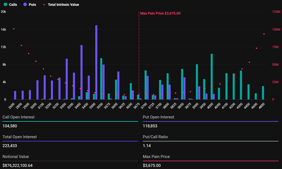 Рівень максимального болю, 3 675 доларів, відповідає номінальній вартості 876,3 мільйона доларів, а PCR 1,14 вказує на більш нейтральний настрій, ніж у випадку з біткоїном.