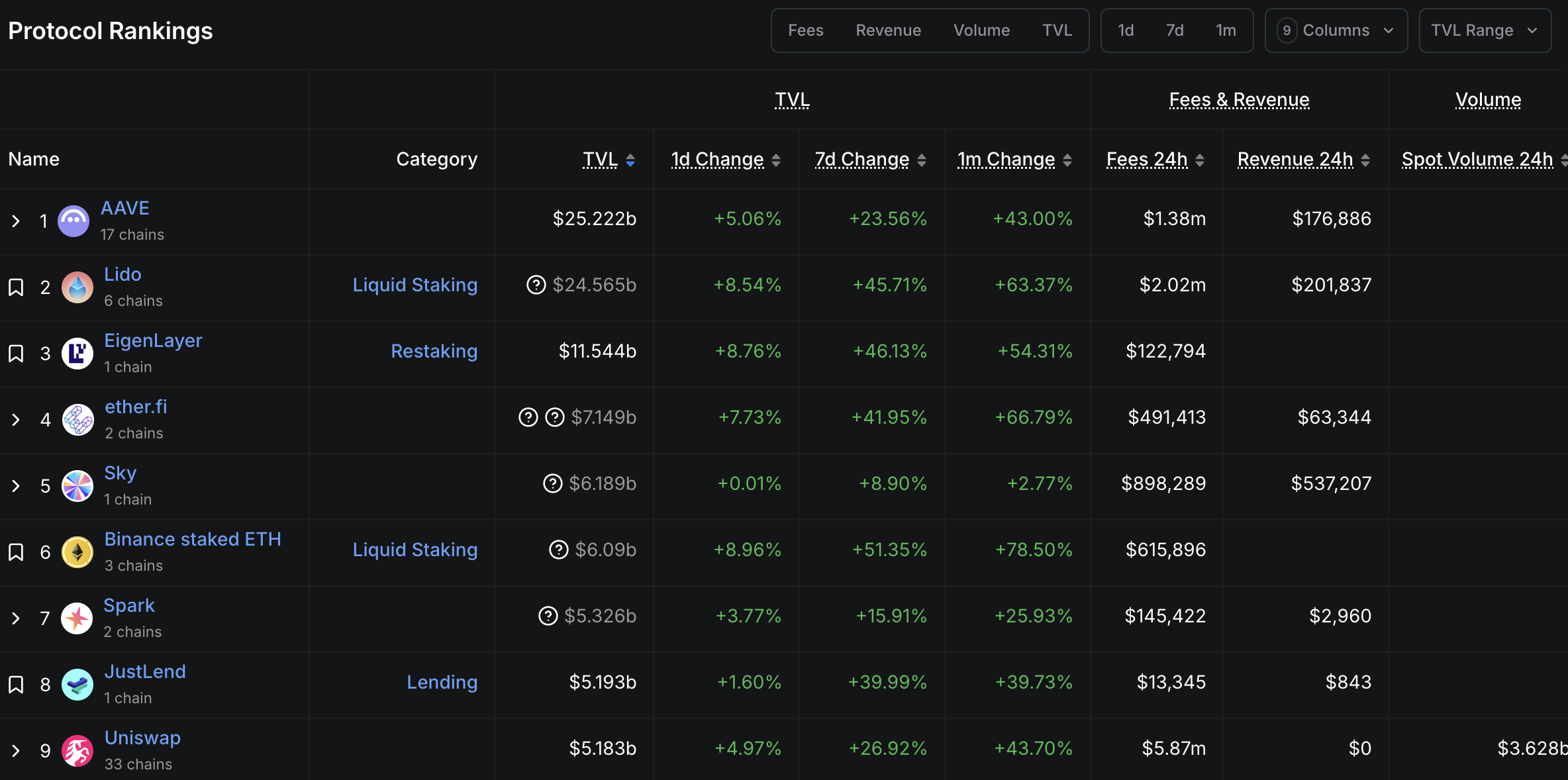 За даними DeFiLlama станом на 14 травня 2025 року, Aave становить понад 21 % TVL ринку DeFi, перевершуючи конкурентів, таких як Lido (LDO) та EigenLayer (EIGEN). Це зростання значною мірою зумовлене великими інвесторами, які депонують значні активи в протокол.