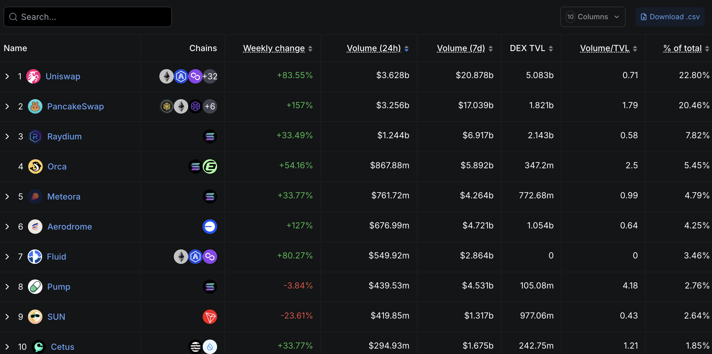 Дані DefilLama станом на 14 травня 2025 року показують, що Uniswap обробляє понад 3,6 мільярда доларів у транзакціях за 24 години, захоплюючи 24 % глобального обсягу торгів DEX, що зміцнює його домінування.
