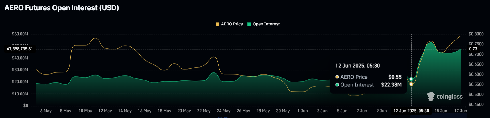 Відкрита зацікавленість у AERO зазнала суттєвого зростання, збільшившись на 112 % за останні п’ять днів. З 22 млн доларів вона досягла 47 млн доларів, що було зумовлено трейдерами, які укладали короткі контракти через побоювання, що ціна може впасти. Однак ринкові настрої змінюються, оскільки ставка фінансування повернулася в позитивну зону.