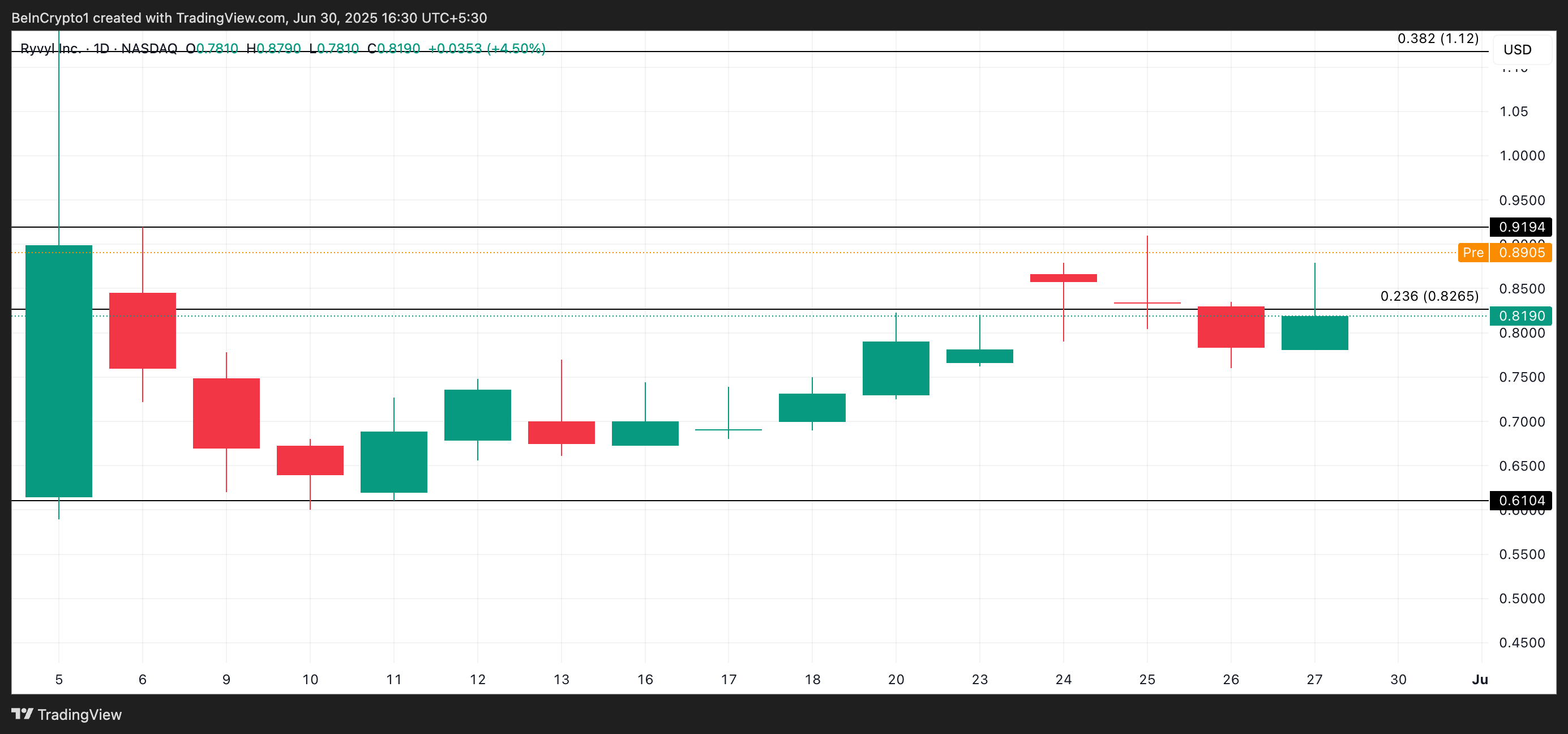 Ціна RVYL може піднятися до 0,91 доларів, якщо купівельна активність збережеться, коли ринок відкриється.