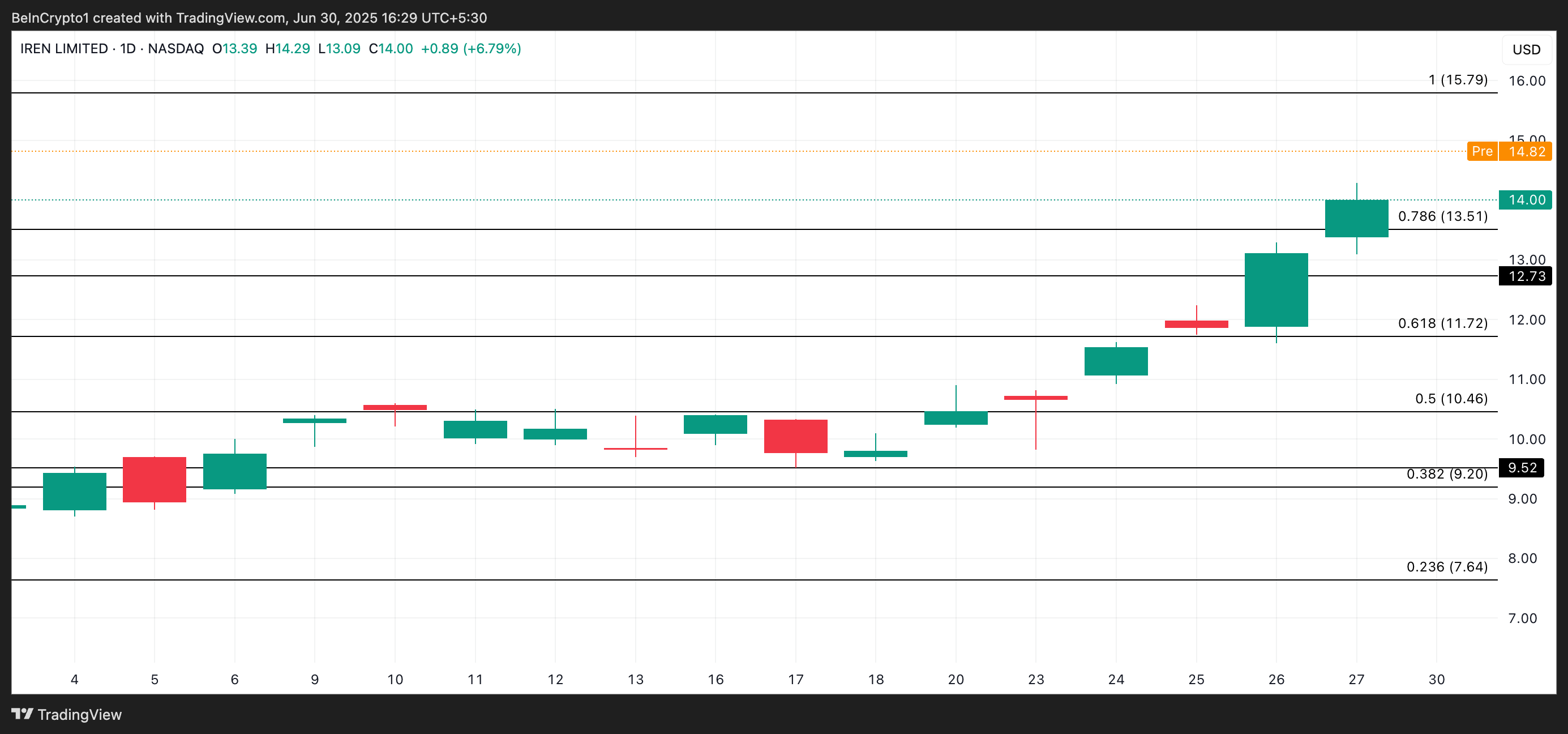 IREN закрила торгову сесію в п’ятницю на рівні 14,00 доларів, що означає зростання на 6,79 % за день. У передринковій торгівлі сьогодні акції IREN оцінюються в 14,82 доларів. Якщо ралі продовжиться, коли ринок відкриється, акції можуть піднятися до 15,79 доларів.