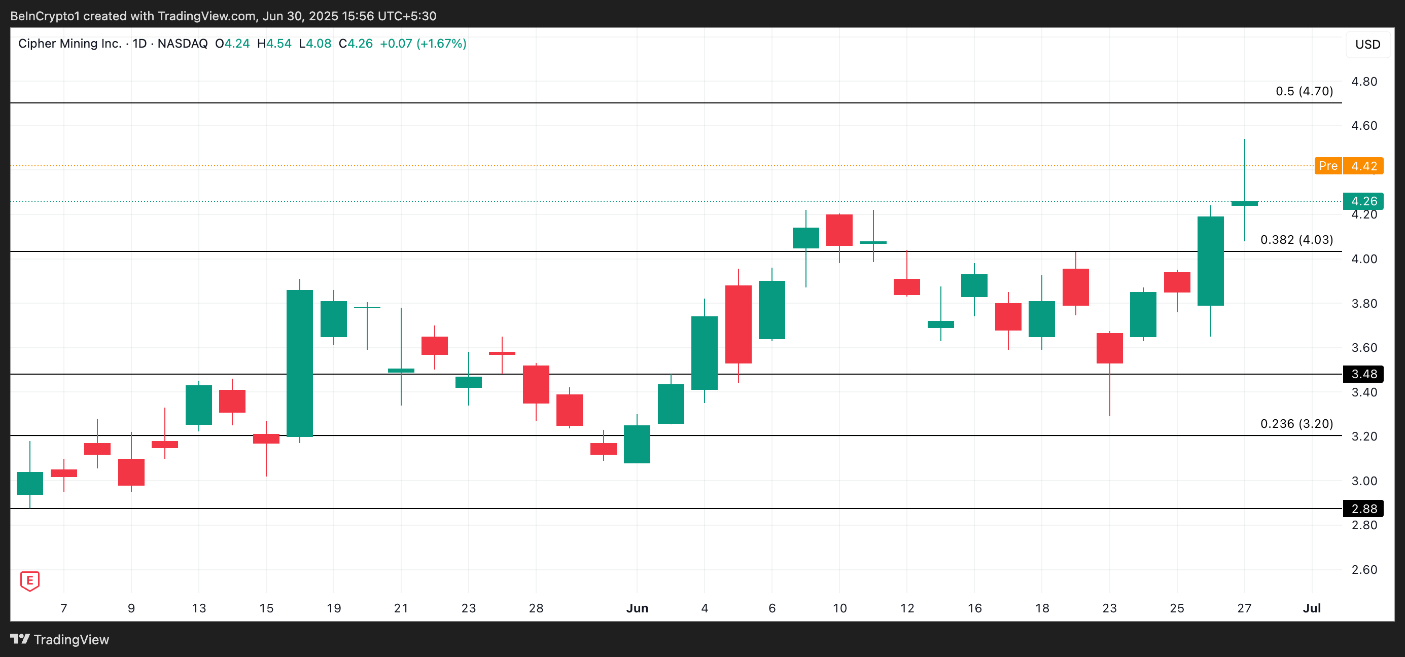 Під час передринкової торгівлі сьогодні акції CIFR оцінюються в 4,42 доларів, що відображає продовження бичачого настрою.