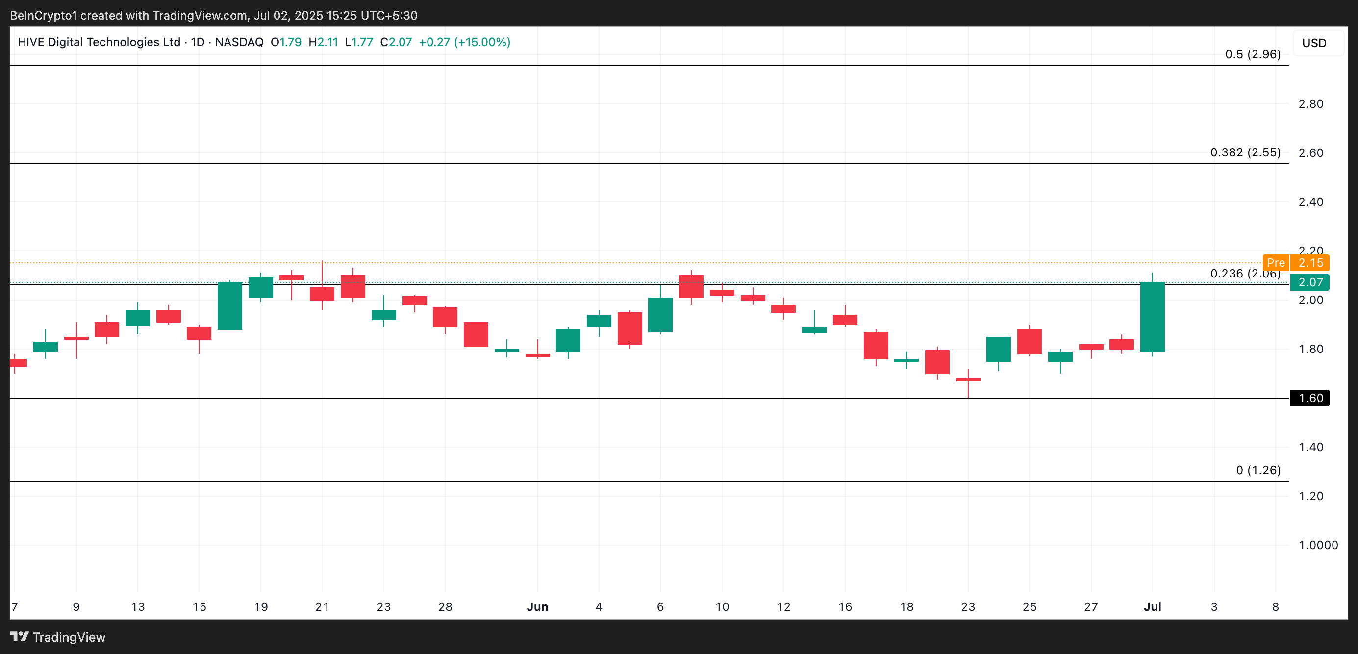 HIVE підскочила на 15 % у попередній сесії, закрившись на рівні 2,07 доларів. Це сталося після нещодавнього звіту про сильні фінансові результати за фінансовий рік, що закінчився 31 березня 2025 року.