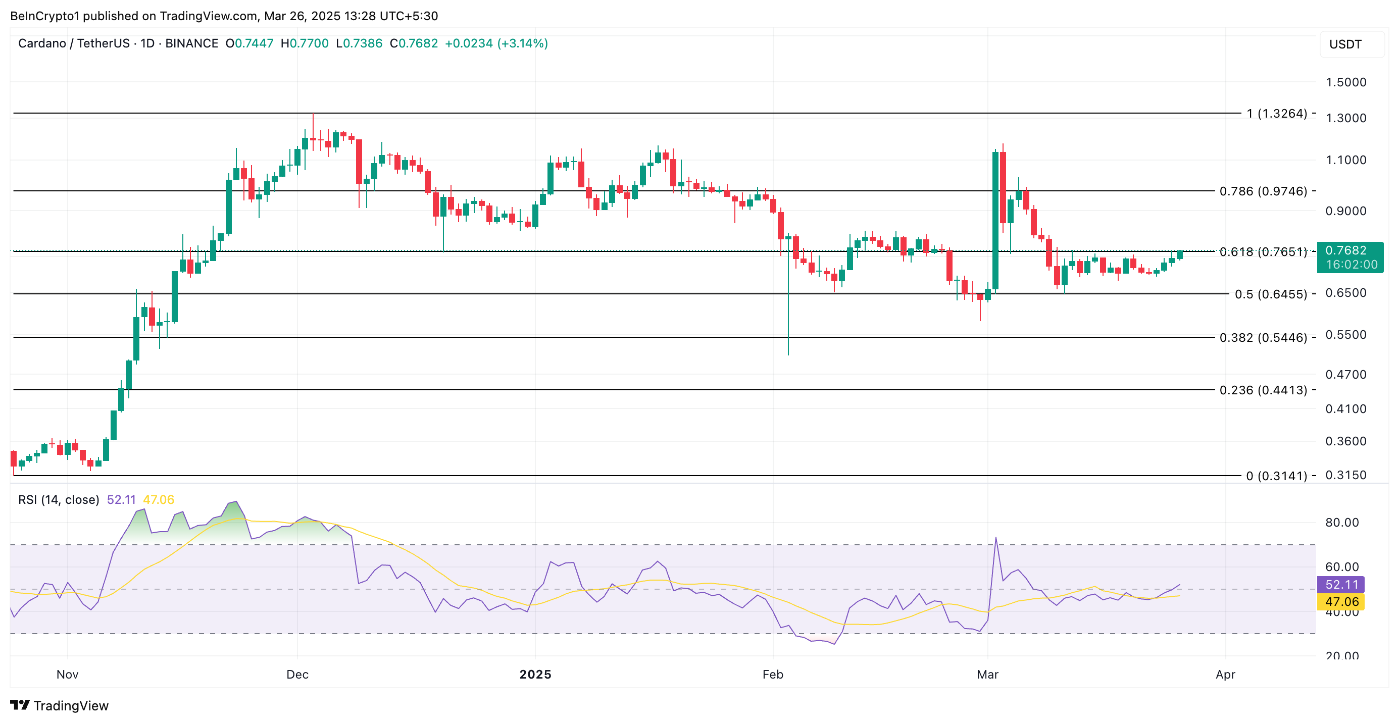 На момент написання ADA торгується за 0,76 доларів, продовжуючи свої здобутки на 4% за останній день. На щоденному графіку індекс відносної сили (RSI) токена перебуває у висхідному тренді на рівні 52,11, що підтверджує активність покупців.