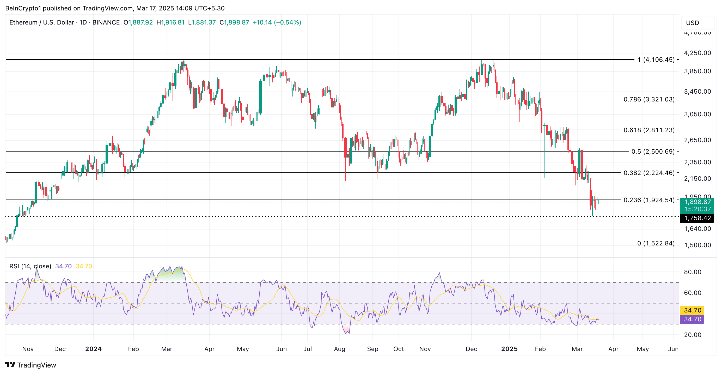Низхідна тенденція, спостережувана в індексі відносної сили (RSI) ETH на щоденному графіку, відображає ослаблення купівельного тиску серед учасників ринку. На момент публікації цей індикатор імпульсу становить 34,70.