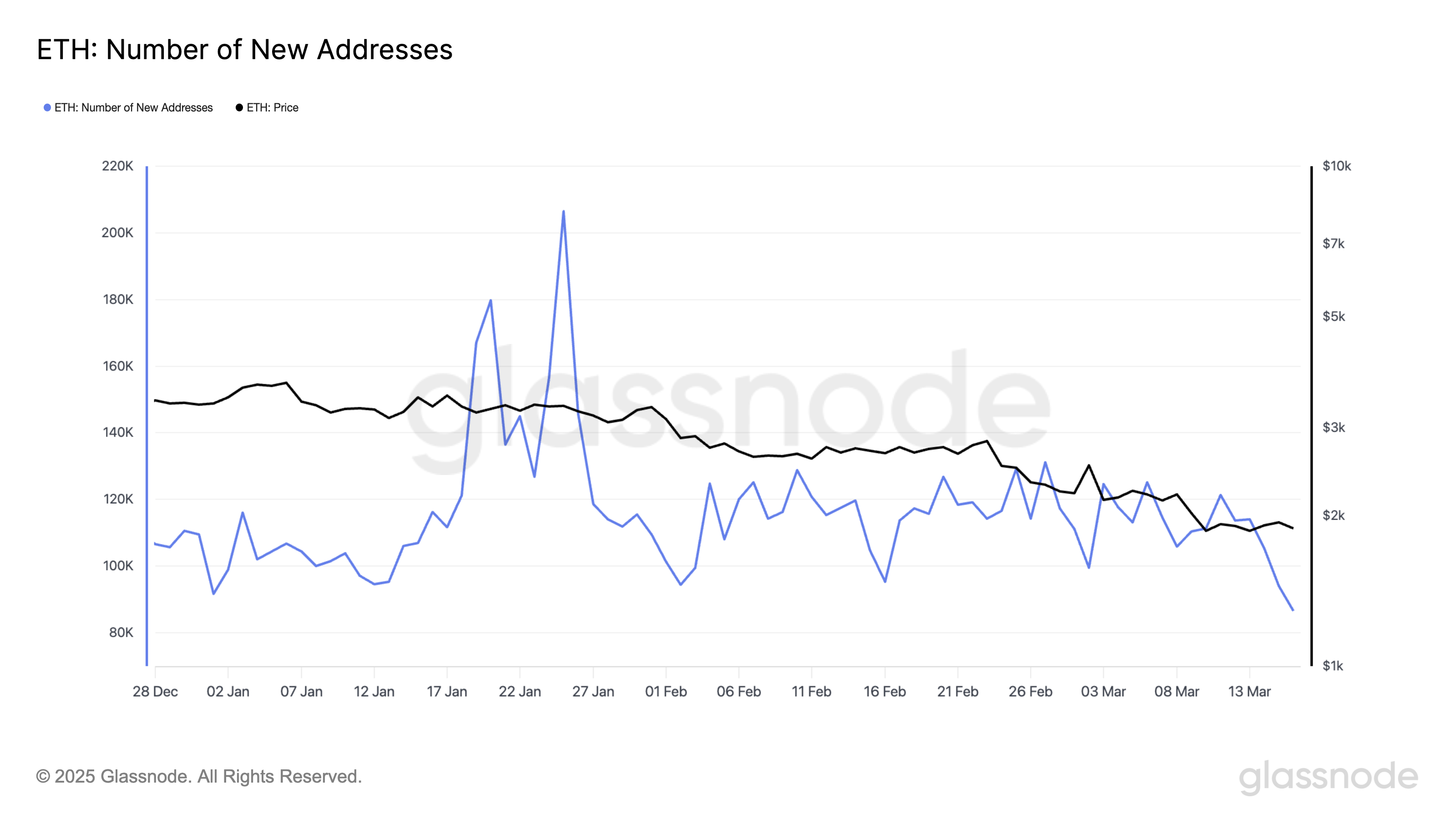 Крім того, новий попит на мережу Ethereum також зменшився. За даними Glassnode, кількість нових гаманців, створених для торгівлі ETH, склала 86 539 адрес у неділю, що є найнижчим щоденним показником з початку року.