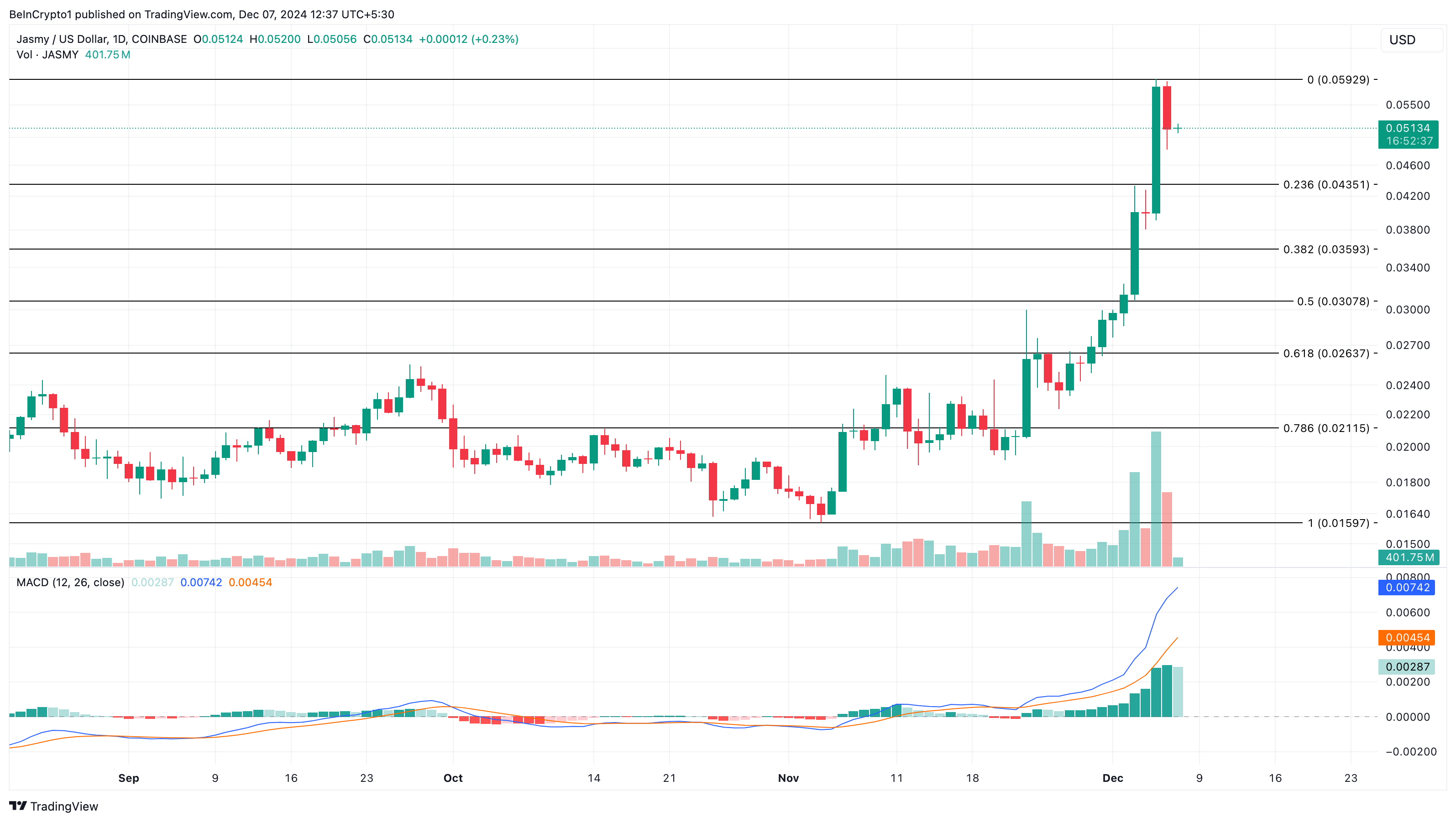 В результаті ринкова капіталізація перевищила $2,5 мільярда. З огляду на позитивний Індикатор Зближення/Розбіжності Середніх (MACD), здається, що ціна JASMY може бути вищою в короткостроковій перспективі.