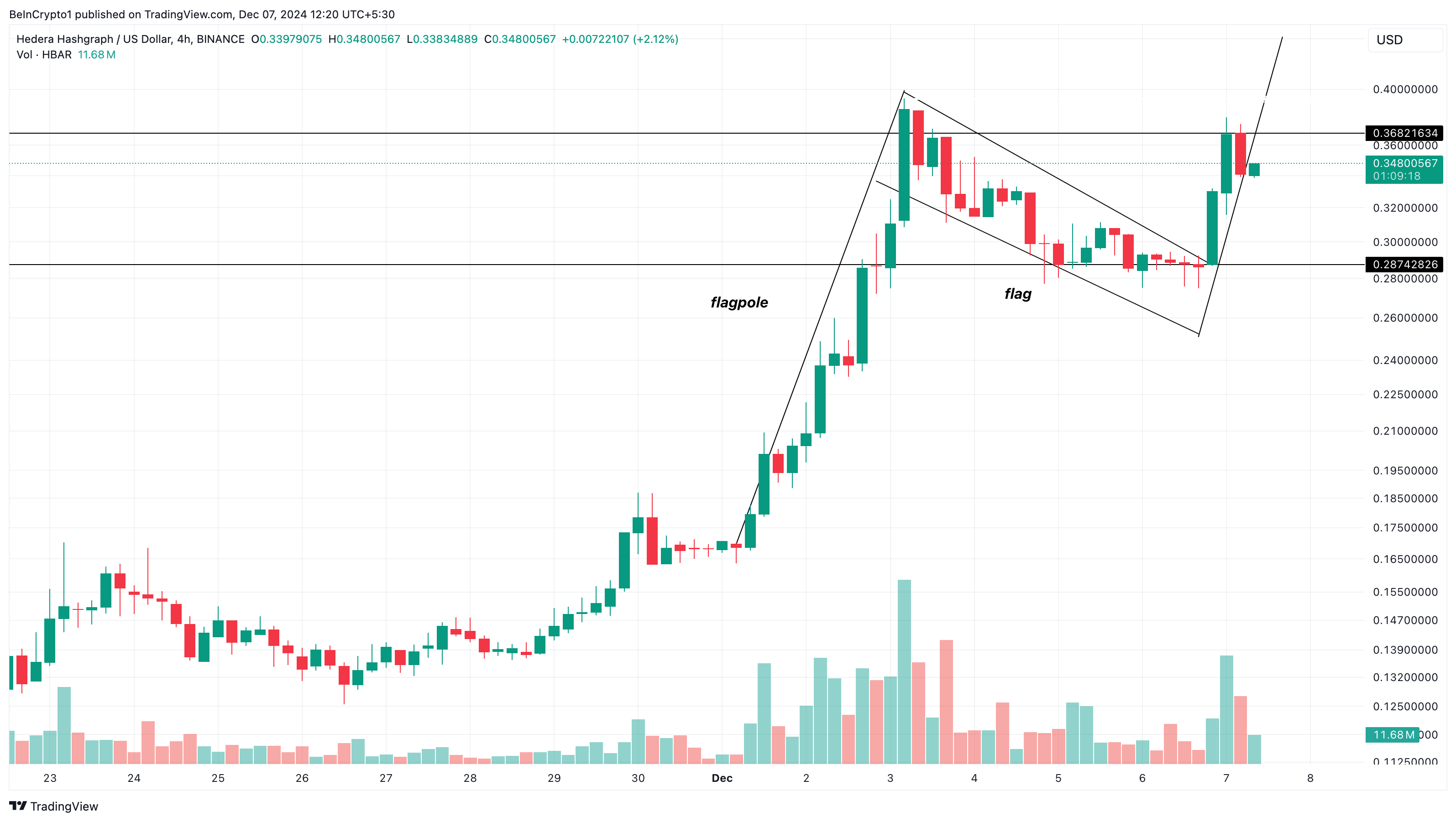 З цим патерном ціна HBAR може зрости до $0,50, якщо вона подолає опір на $0,39. Однак, якщо ведмеді чинитимуть опір прориву, це може не статися, і ціна може знизитися до $0,29.
