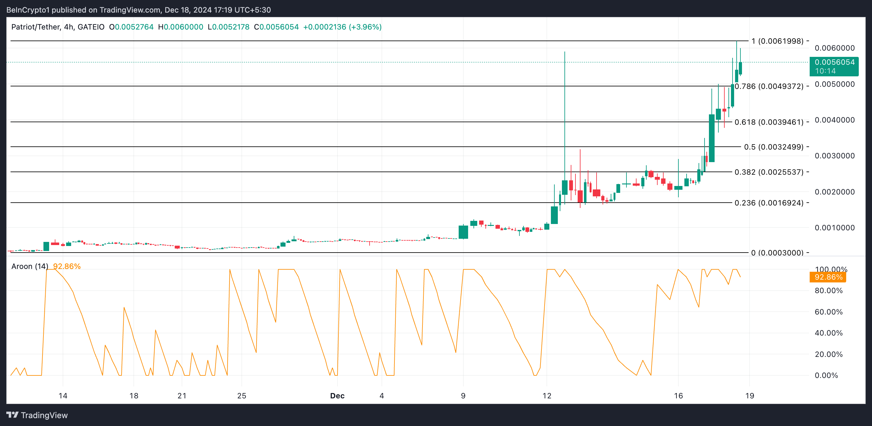 Токен, натхненний Дональдом Трампом PATRIOT піднявся до історичного максимуму $0,0061 під час ранкової торгової сесії. На момент написання, альткоїн торгується за $0,0056 після невеликого відкату.