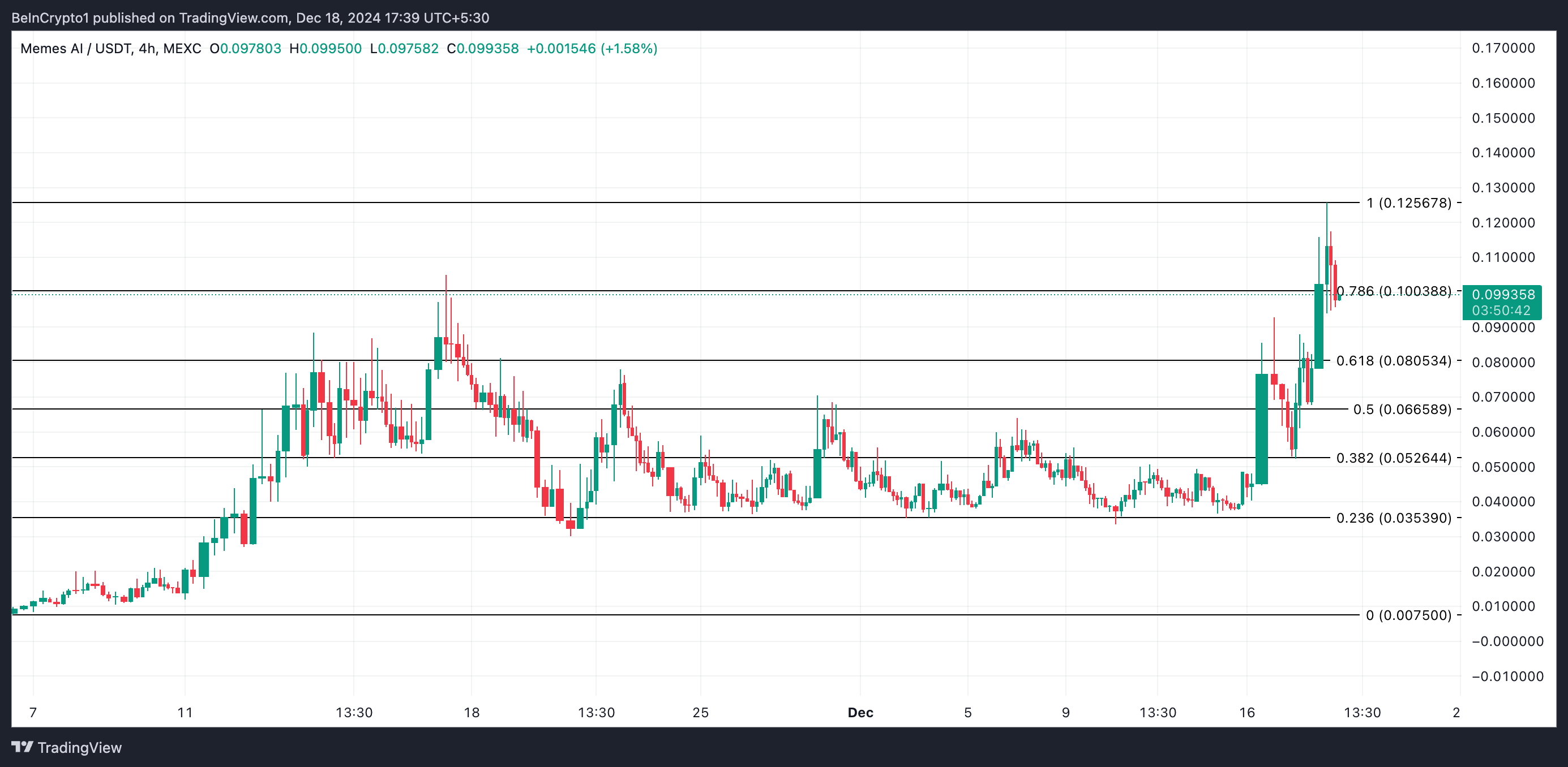 Описаний як «мем-коїн на Solana з AI», MEMESAI піднявся до історичного максимуму $0,12 раніше сьогодні. Хоча він знизився на 18%, мем-коїн все ще на 19% вище за останні 24 години.