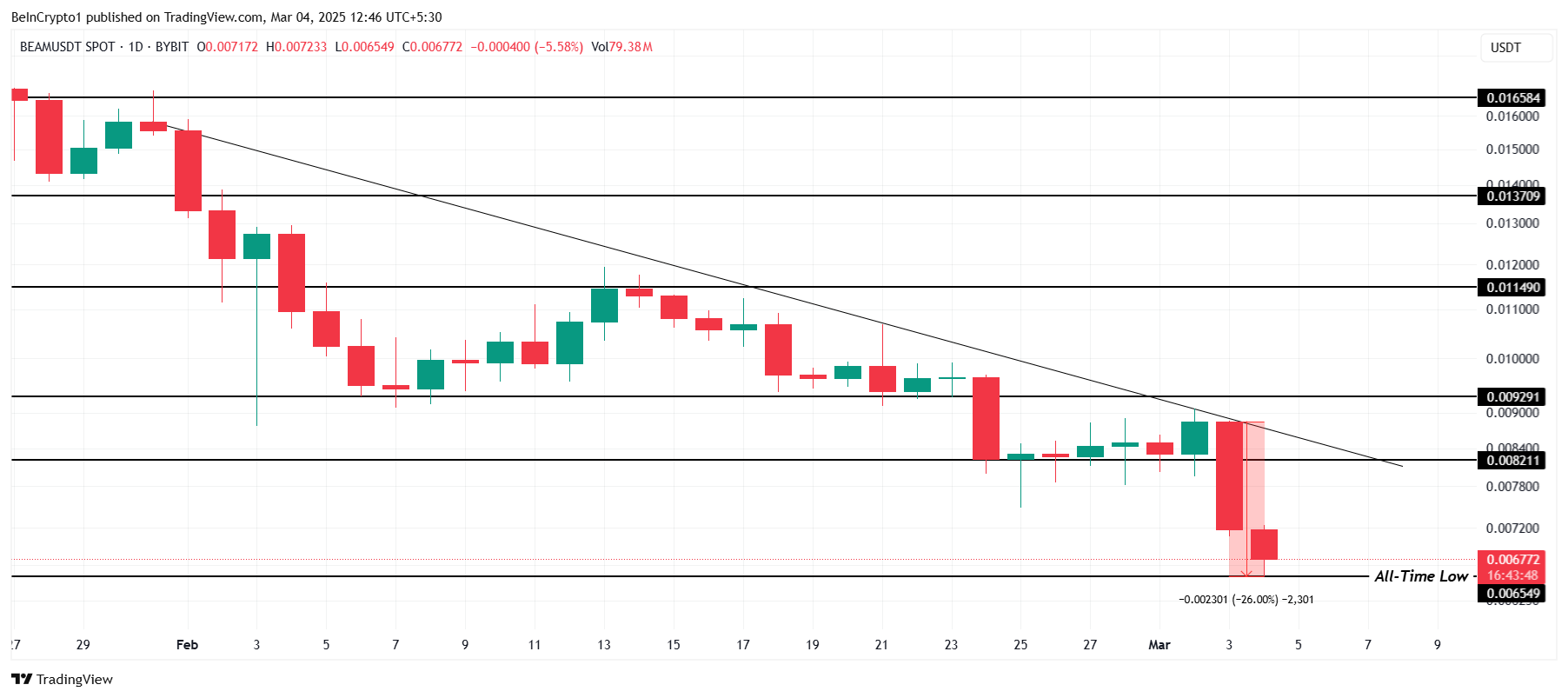 Ціна BEAM впала на 26%, досягнувши історичного мінімуму 0,0065 доларів перед незначним відскоком. На момент написання, BEAM торгується на рівні 0,0067 доларів, намагаючись відновити стабільність. Різке падіння відображає стійкий ведмежий тиск, з обмеженими ознаками негайного відновлення, оскільки ринкові настрої залишаються слабкими.