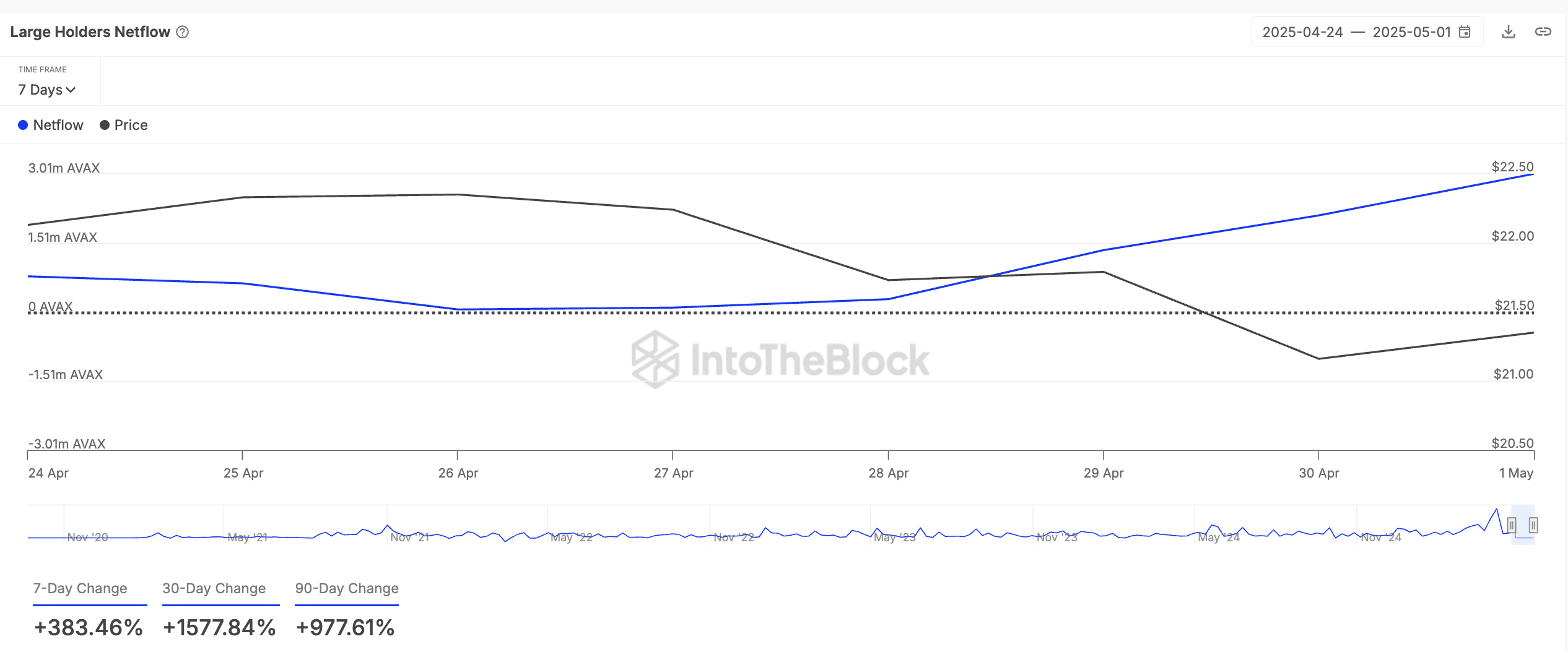 Токен рівня-1 (L1) AVAX привернув підвищену увагу китів цього тижня, що відображається у зростанні чистого потоку великих власників. За даними IntoTheBlock, цей показник зріс на понад 380 % за останні сім днів.