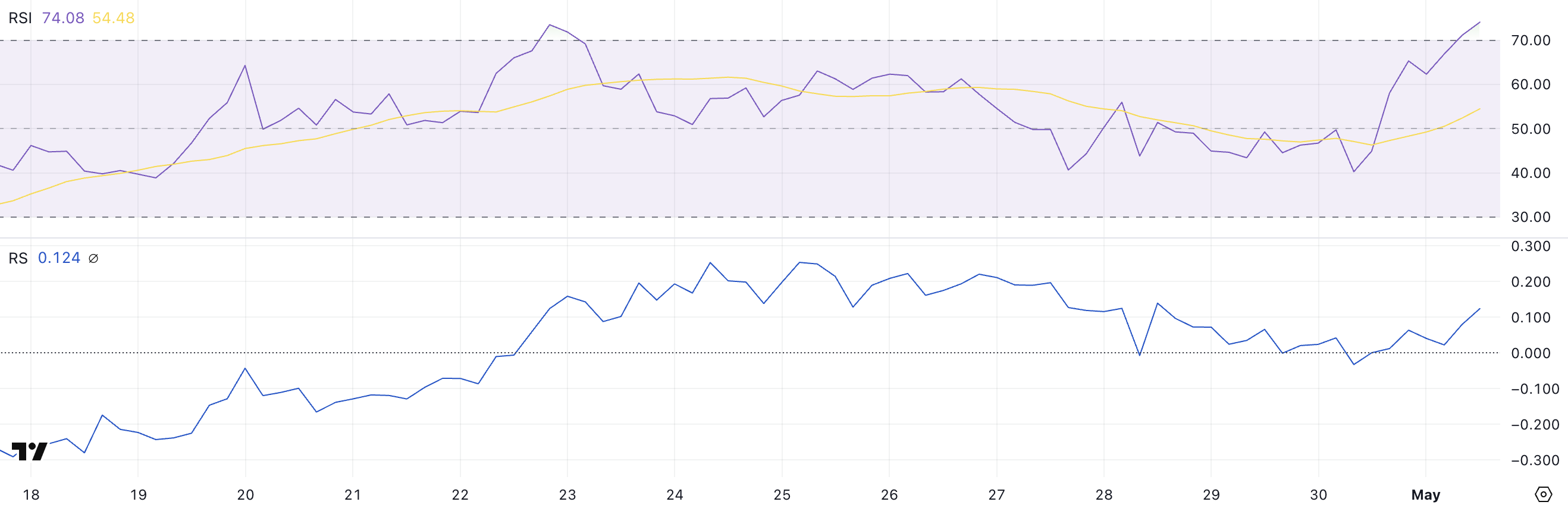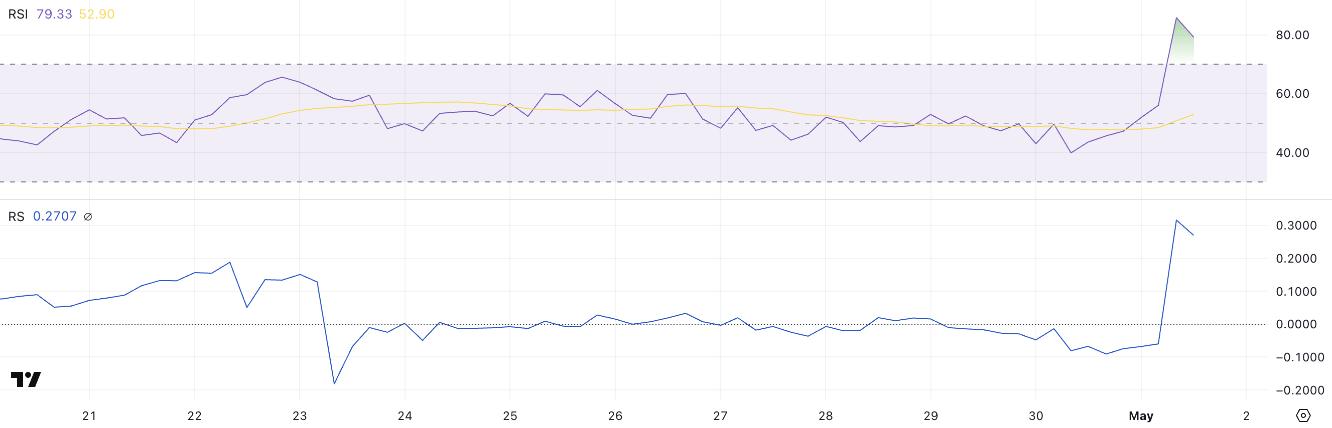 Ця комбінація — високий RSI та низький RS — свідчить про те, що недавнє ралі може бути нестійким.