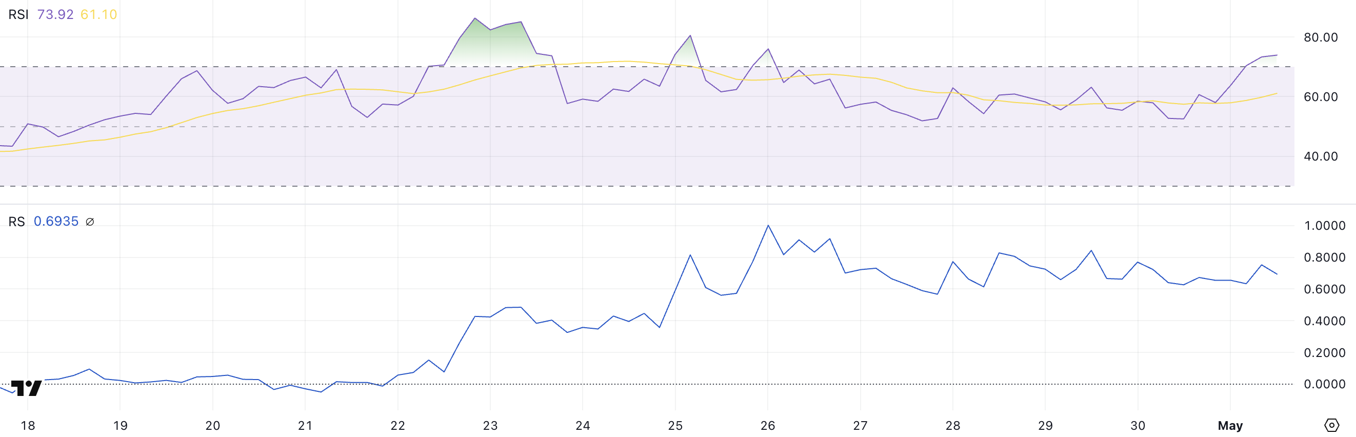 Ця комбінація — дуже високий RSI та низький RS — часто вказує на нестійкий рух, зумовлений більше гайпом, ніж підґрунтям сили.