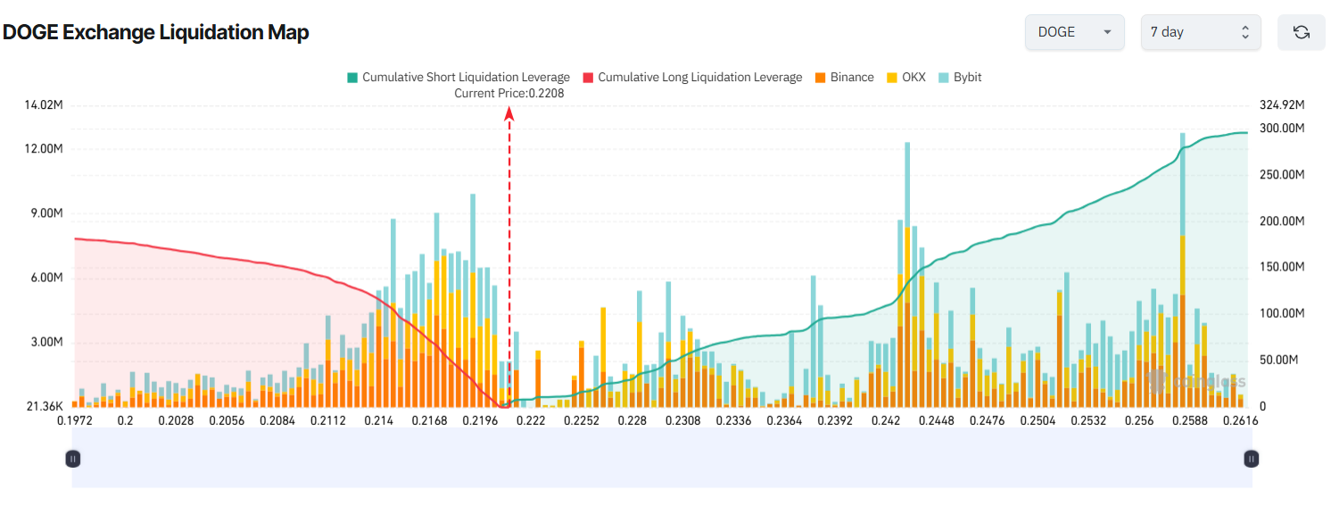 Якщо DOGE впаде нижче 0,20 долара цього тижня, накопичені ліквідації довгих позицій можуть перевищити 176 млн доларів. Навпаки, якщо DOGE підніметься назад до 0,26 долара, близько 290 млн доларів у коротких позиціях будуть ліквідовані.