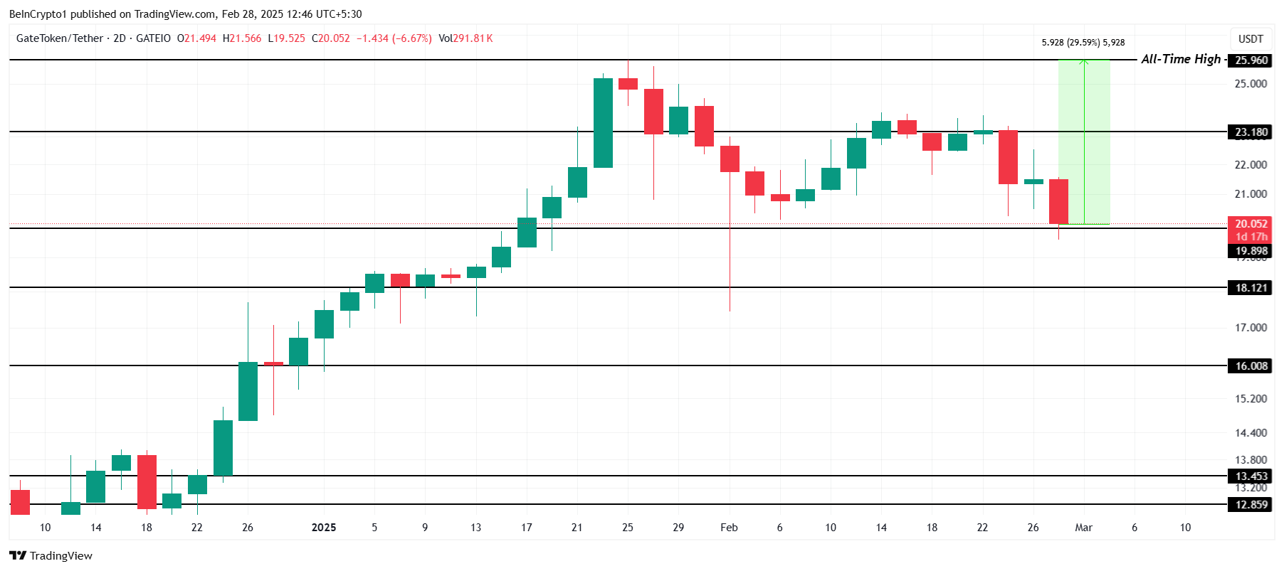 Ціна GT у січні показала виняткову продуктивність, досягнувши історичного максимуму (ІМ) у 25,96 доларів. Однак відтоді її траєкторія зазнає спадного тренду. Попри це, інвестори залишаються оптимістичними, адже цей альткоїн усе ще може піднятися, щоб перевершити свій попередній рекорд.