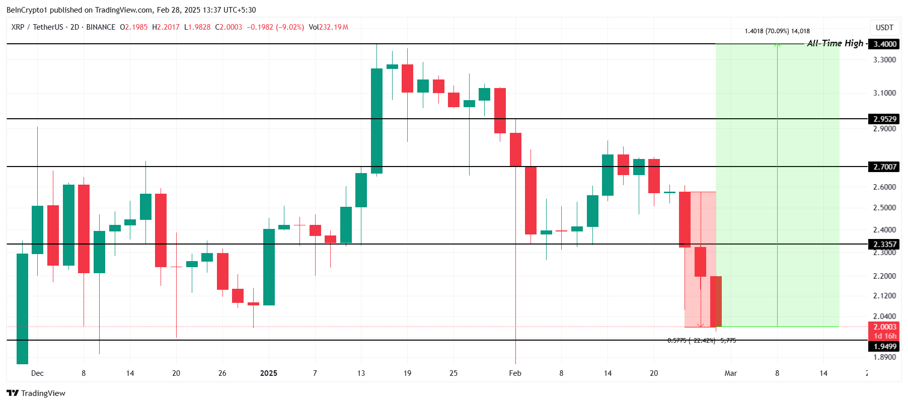 Ціна XRP наразі торгується на рівні 2,00 доларів, значно нижче свого історичного максимуму (ATH) у 3,40 доларів. Щоб досягти ATH, XRP потребує підйому на 70%. Недавнє падіння на 22% за останній тиждень ще більше віддалило альткоїн від попереднього висхідного імпульсу, викликаючи занепокоєння.