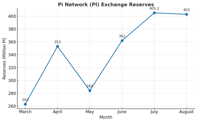 Звіт BeInCrypto наприкінці липня попереджав, що запаси Pi Network (PI) на біржах перевищили 405 мільйонів PI. Однак, за даними Piscan, ця цифра трохи знизилася до 403 мільйонів PI після першого тижня серпня.
