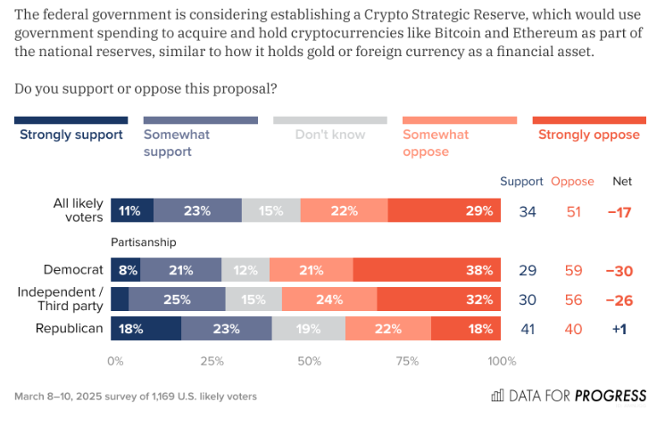 Нещодавнє опитування, проведене Data for Progress з 08.03.2025 по 10.03.2025, опитало 1 169 ймовірних виборців у США щодо їхньої позиції стосовно урядових ініціатив, пов’язаних з криптовалютами.
