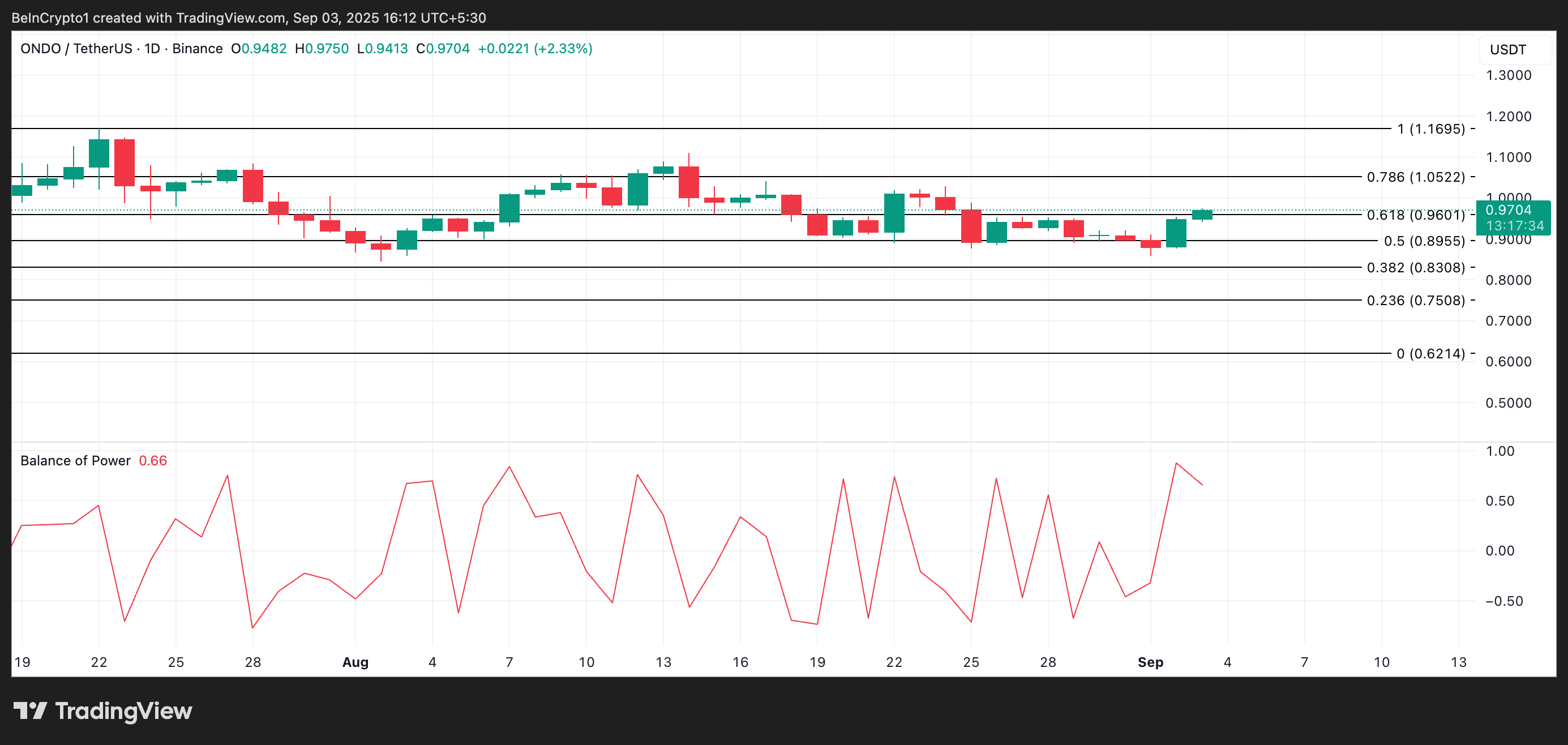 На момент виходу статті ONDO торгується за 0,9703 долара. Показання денного графіка ONDO/USD підтверджують бичачий тиск ринку.
