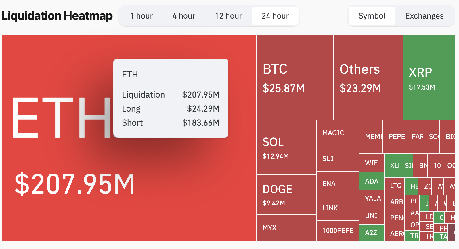 Дані з Coinglass показують, що ліквідації коротких позицій склали 184 млн доларів за останні 24 години, тоді як ліквідації довгих позицій залишаються відносно скромними на рівні близько 24 млн доларів.