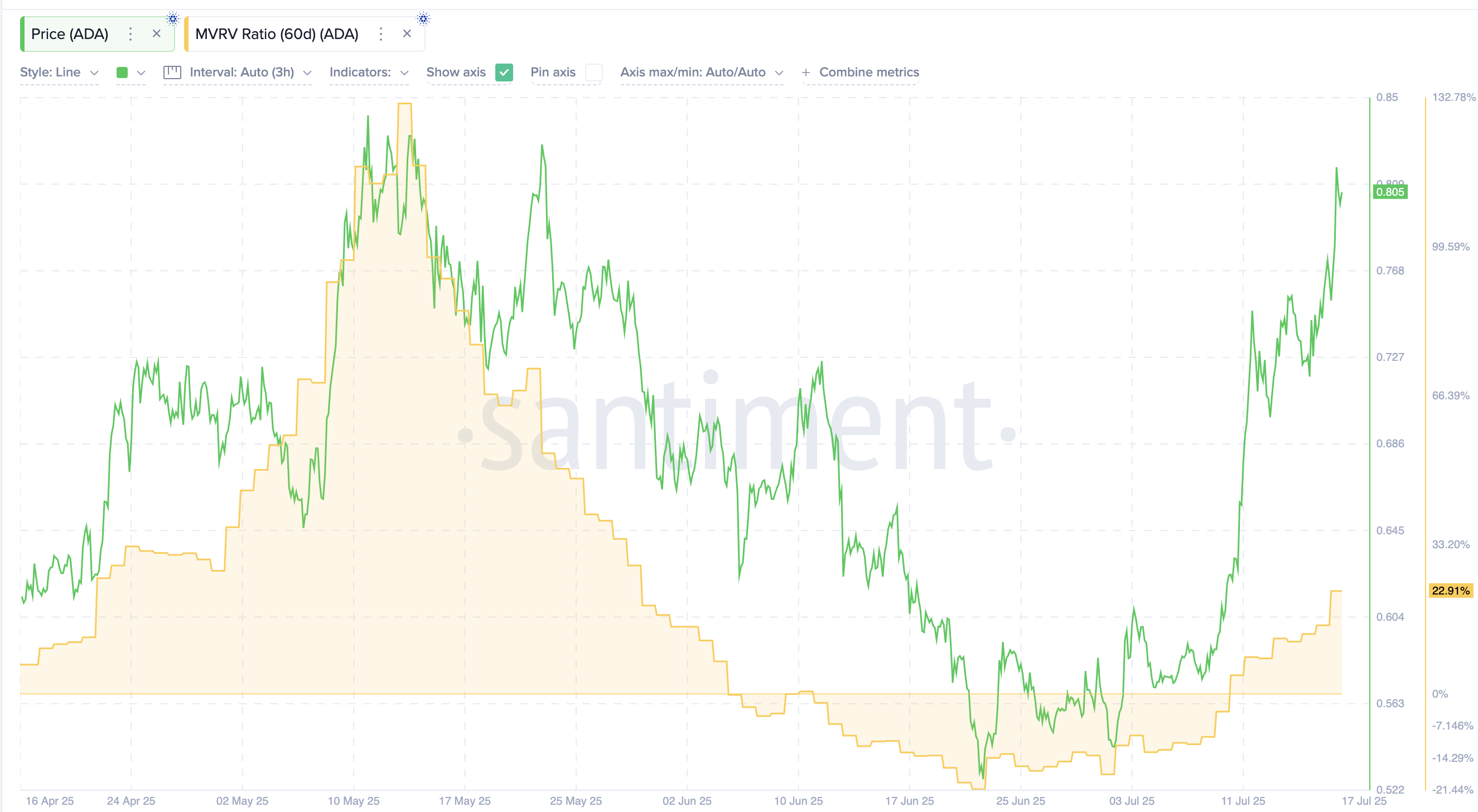 Хоча старі токени залишаються на місці, навіть нові утримувачі можуть не планувати продавати найближчим часом. 60-денний коефіцієнт MVRV для Cardano становить 22,91%, що значно нижче попередньої зони небезпеки. У середині травня цей же коефіцієнт перевищив 131%, безпосередньо перед початком різкого розпродажу. Історично склалося так, що ADA має простір для зростання, поки MVRV не досягне значно вищих зон прибутку.