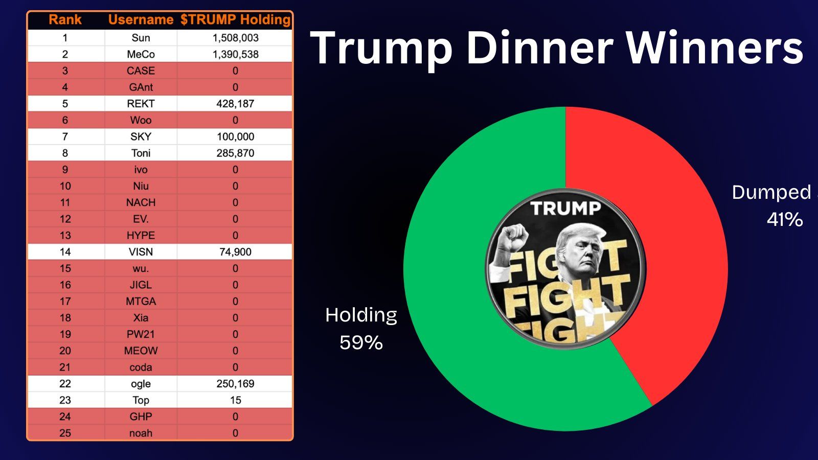 Вечеря TRUMP, на яку запросили 220 провідних тримачів токена, яскраво продемонструвала опортуністичні настрої інвесторів. Згідно з аналізом даних, проведеним користувачем “dethective” у соціальних мережах, 92 учасники заходу повністю позбулися своїх токенів TRUMP перед подією. Після вечері загальна кількість TRUMP токенів в обігу зменшилася з 11,3 мільйона до 7 мільйонів.