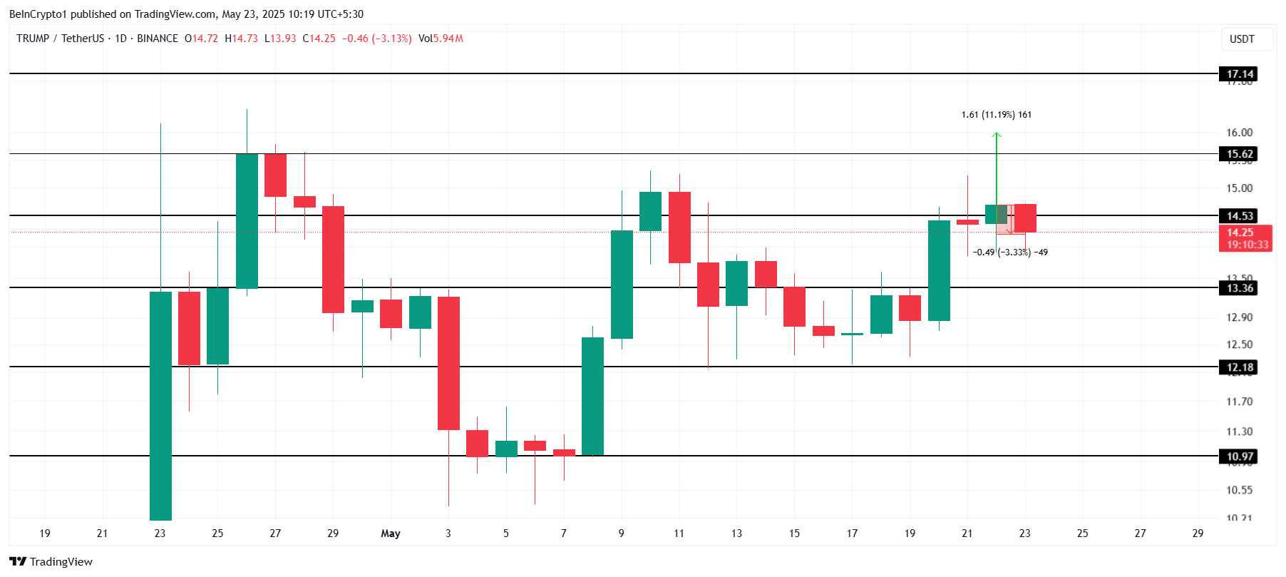 У разі посилення тиску продажів ціна TRUMP може впасти до наступного рівня підтримки — 13,36 доларів. Якщо цей рівень буде пробитий, бичачий прогноз втратить актуальність. Падіння нижче 13,36 доларів може спровокувати подальше зниження, сигналізуючи про зміну настроїв інвесторів і потенційний довгостроковий спад.