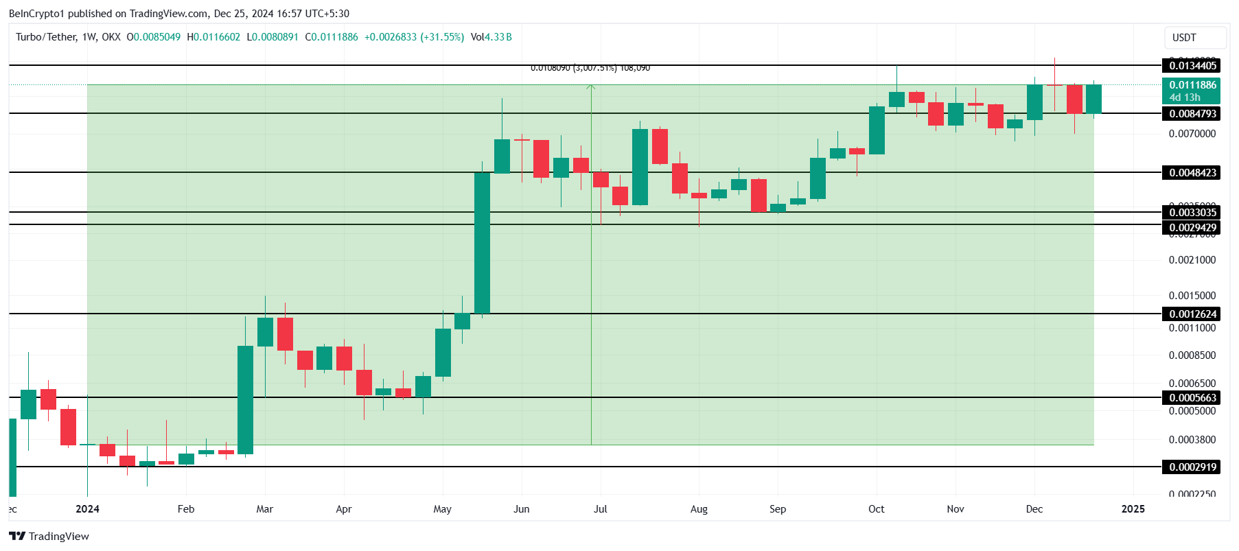 Попит на мем-монети не оминув і AI. Це видно на прикладі Turbo (TURBO), який зумів зафіксувати зростання на 3 000% від початку року. За останні кілька тижнів альткоїн здебільшого рухався вбік, але незабаром може відзначити прорив вище 0,0134 USD.