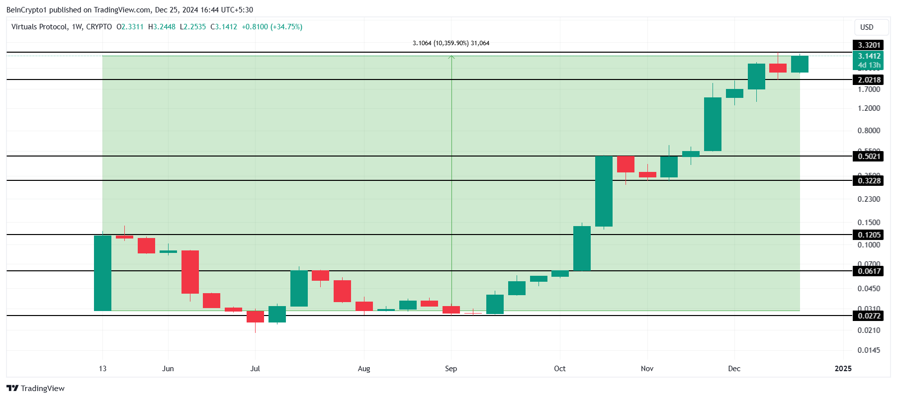 Новим токеном у цій категорії буде Virtuals Protocol (VIRTUAL), який показав зростання на 10 359% від початку року. Це зростання підняло альткоїн з мінімумів до 0,029 USD до 3,141 USD на момент написання.