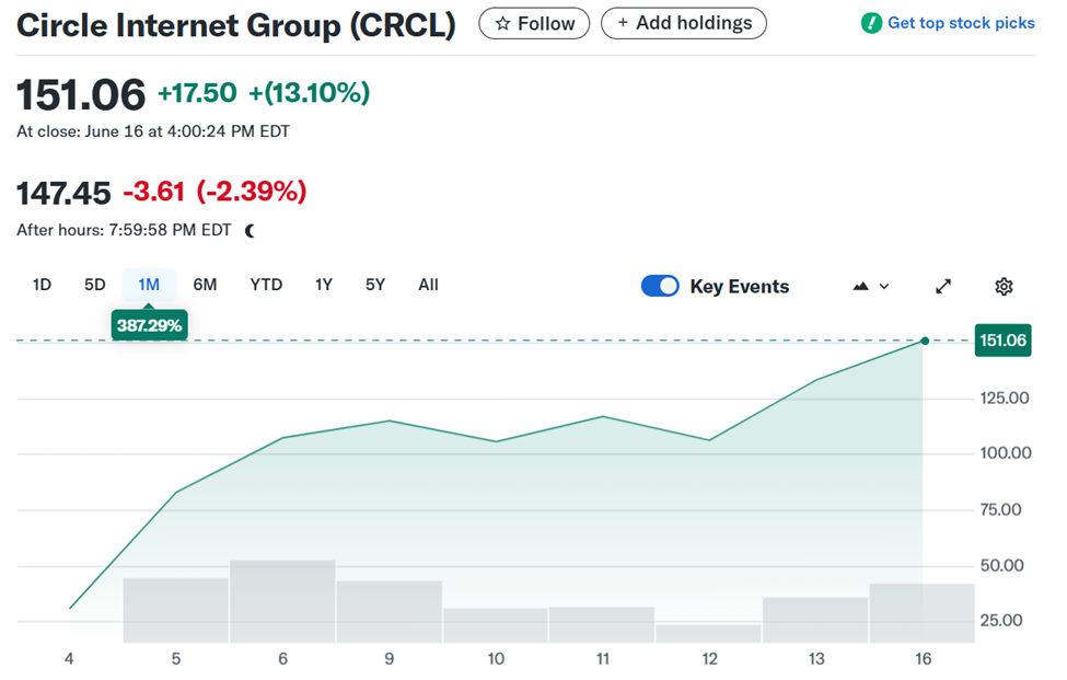 Дані з Yahoo Finance показують, що акції CRCL Circle торгувалися на рівні 147,45 доларів у позабіржовій торгівлі.