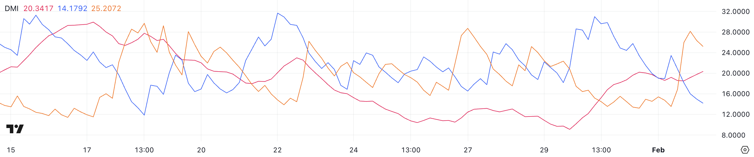 +DI (позитивний напрямковий індикатор) різко впав з 30,9 до 14,1, тоді як -DI (негативний напрямковий індикатор) зріс з 13,5 до 25,2, сигналізуючи про зміну імпульсу в бік зниження.