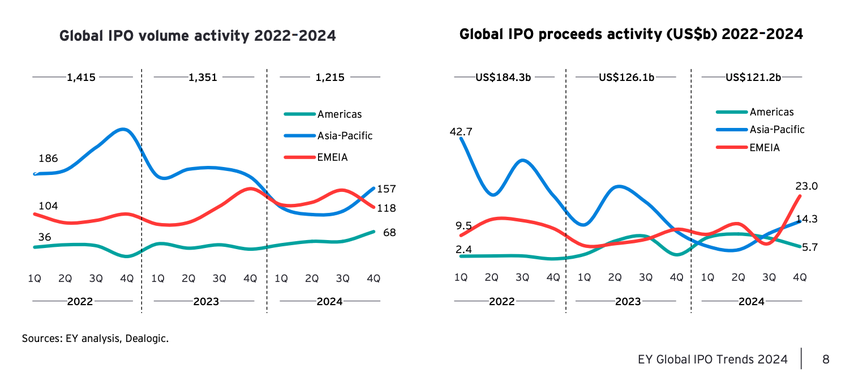 - Ринок IPO в Азіатсько-Тихоокеанському регіоні відновився з двозначним зростанням наприкінці 2024 року (EY).