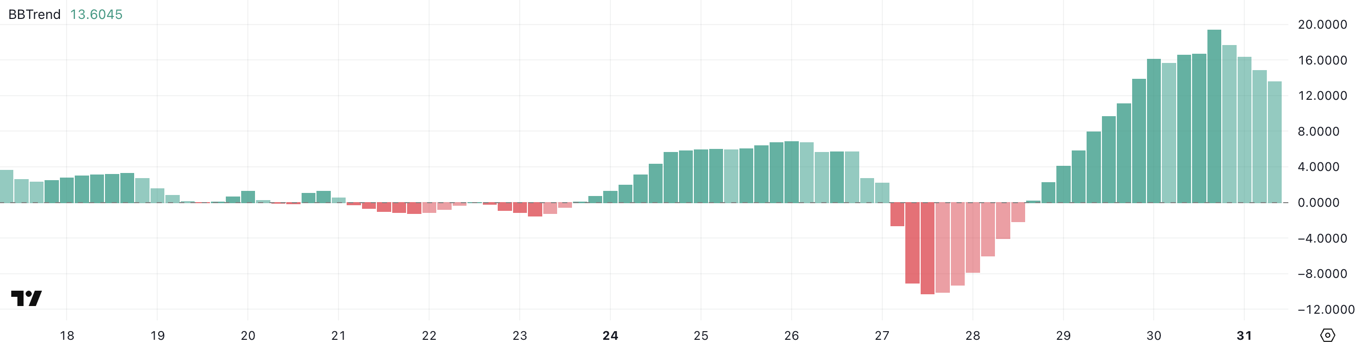Продовження позитивного BBTrend вказує на те, що актив все ще демонструє силу, попри незначний відкат від вчорашнього пікового значення.