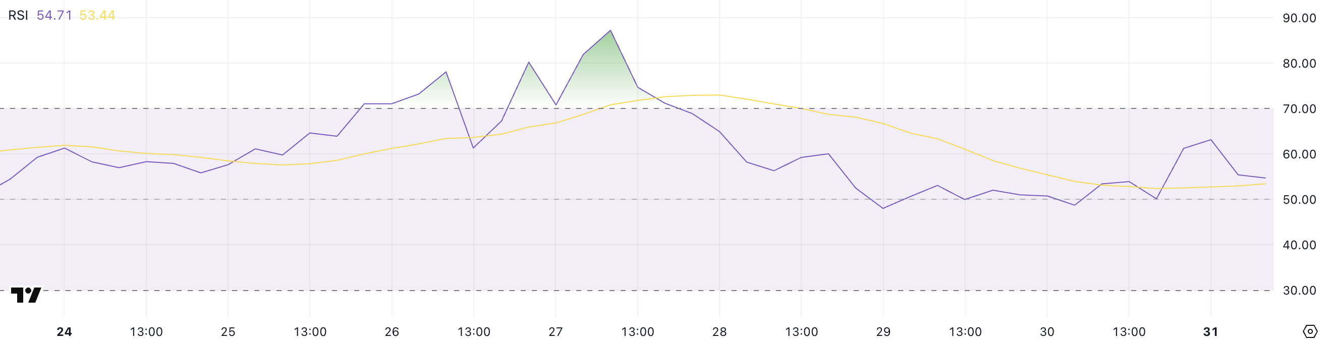 RSI SAFE наразі становить 54,71, зберігаючи нейтральну позицію протягом останніх трьох днів після значного імпульсу на початку тижня.