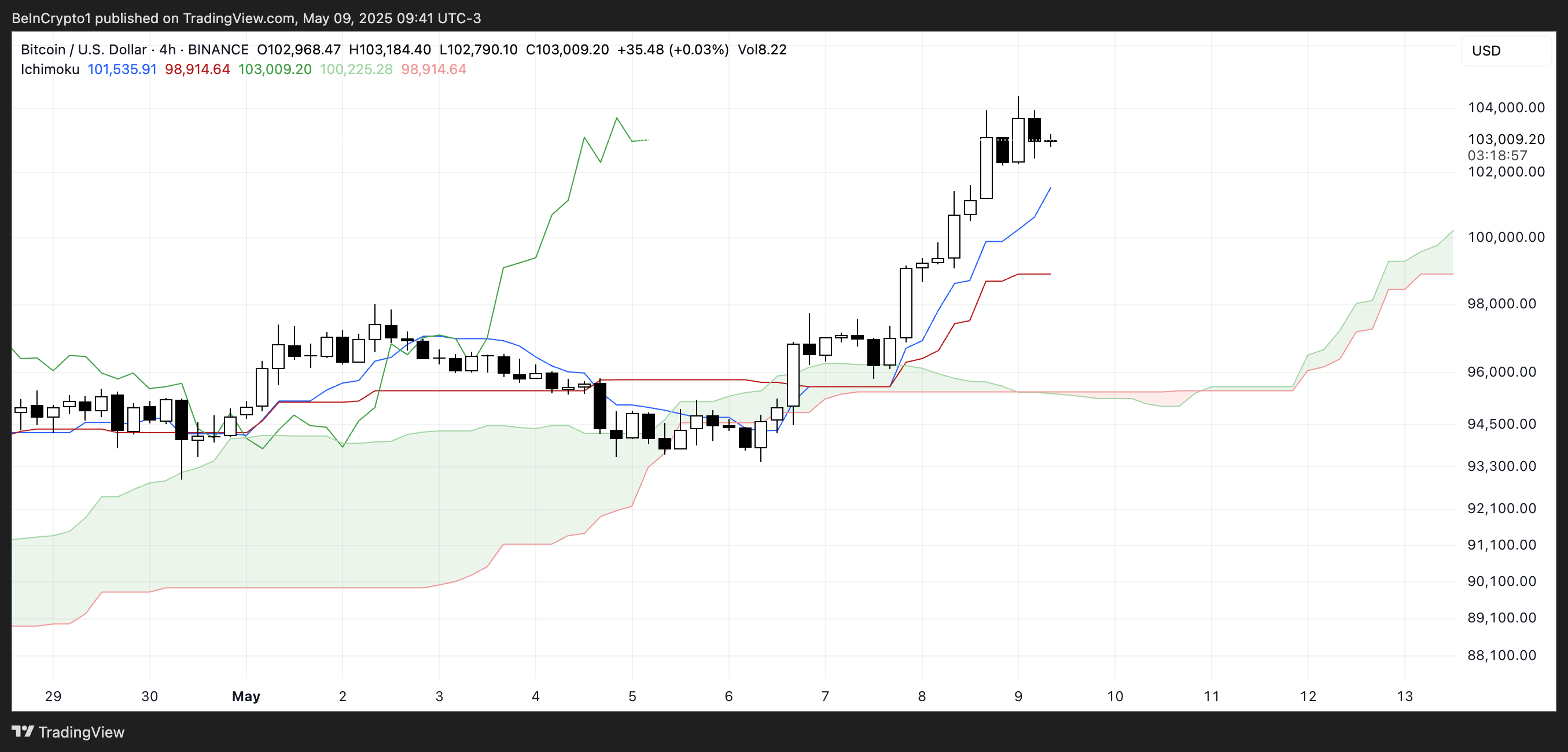 Лагуючий спан (зелена лінія) розташований вище хмари, що ще більше підтримує бичачий прогноз. Якщо ціна не закриється нижче синьої лінії Tenkan-sen або хмара не почне тоншати чи червоніти, упередженість залишається сильно бичачою.