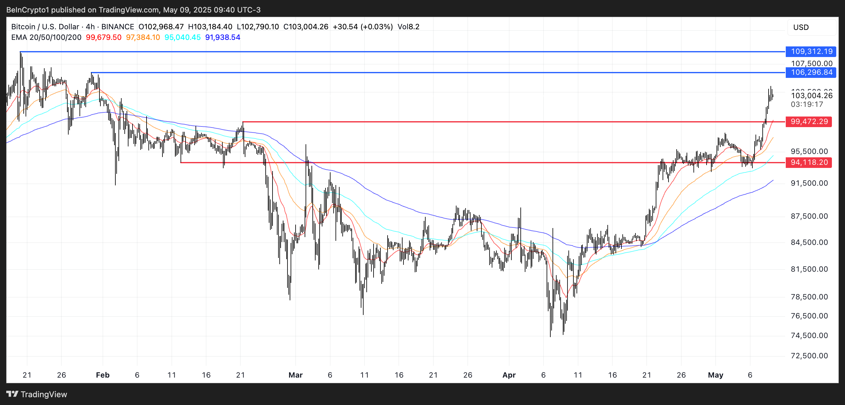 Лінії EMA біткоїна наразі сигналізують про сильний бичачий моментум, причому короткострокові середні розташовані вище довгострокових. Якщо цей висхідний тренд збережеться, ціна біткоїна може незабаром кинути виклик опору на рівні 106 296 доларів.