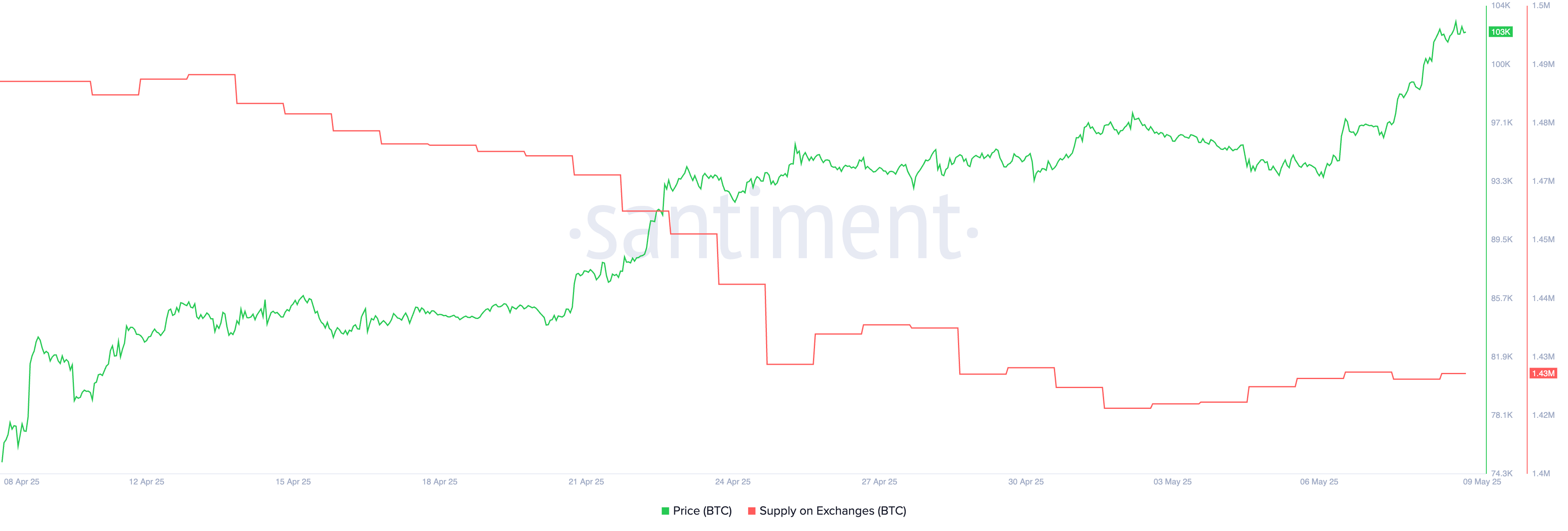 Між 13 квітня та 25 квітня пропозиція біткоїна на біржах зазнала різкого та постійного зниження, впавши з 1,49 млн до 1,43 млн BTC. Це зниження на 60 000 BTC за лише 12 днів відображає один з найзначніших відтоків, що спостерігалися в останні тижні, що свідчить про сильну акумуляційну поведінку на ринку.