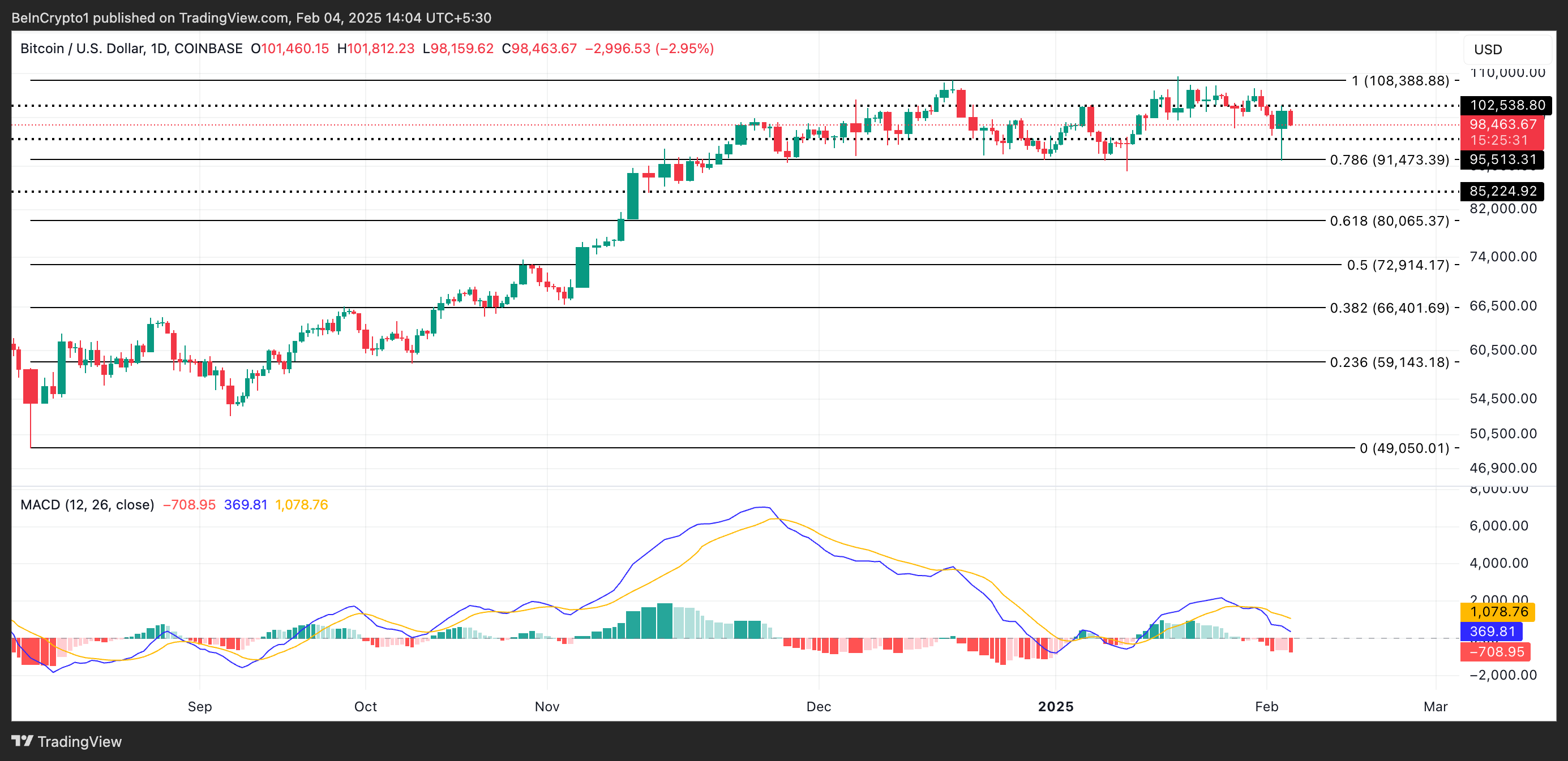 BTC наразі торгується за 98 463 доларів, трохи нижче критичного рівня опору, сформованого на 102 538 доларів. Хоча зміна політики Трампа викликала хвилю накопичення серед трейдерів, показники конвергенції/дивергенції ковзної середньої (MACD) для монети свідчать про те, що ведмежий тиск залишається сильним.