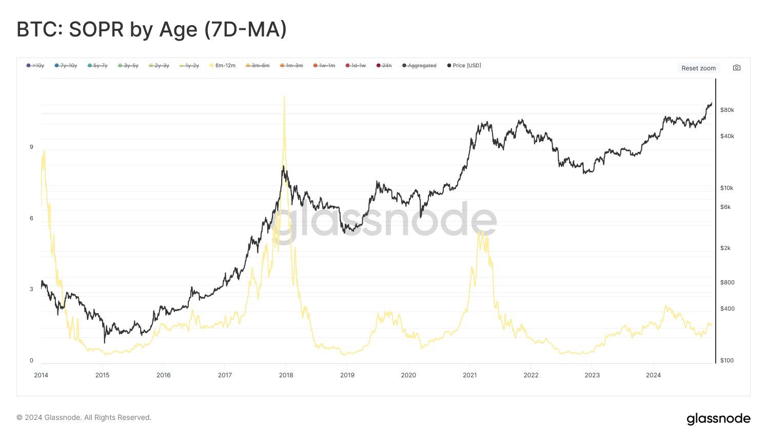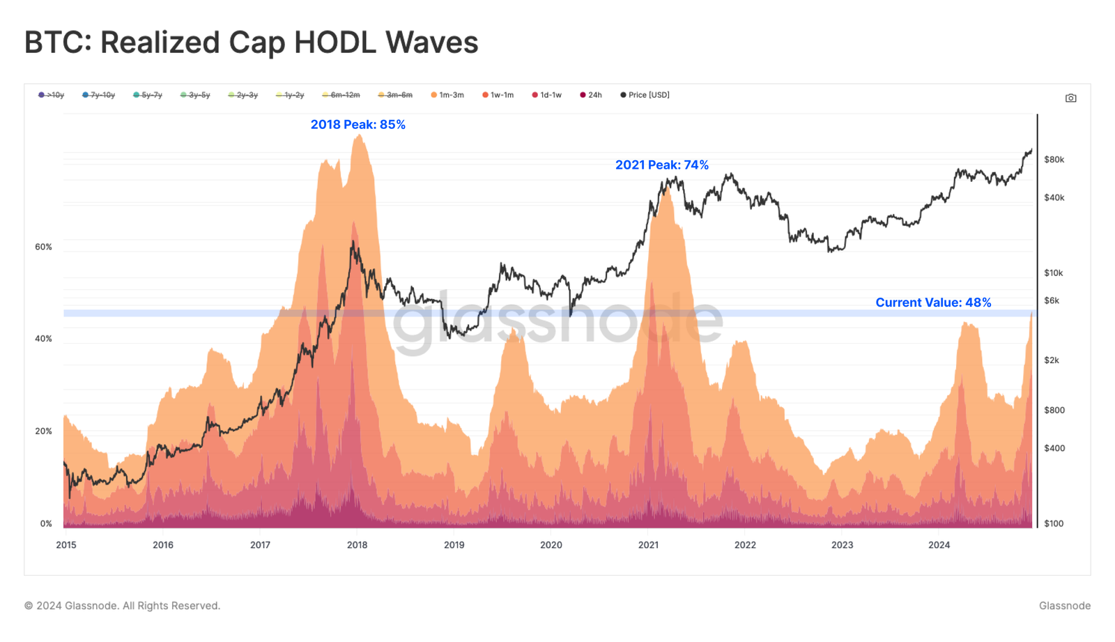 Хвилі HODL показують помітне збільшення багатства, яке утримується нещодавно переміщеним Bitcoin, що вказує на зростання активності з боку попиту. Монети, які раніше утримували довгострокові інвестори, розподіляються новим покупцям, демонструючи, що на ринок надходить новий капітал. Ця тенденція підкреслює зростаючий інтерес до Bitcoin, незважаючи на нещодавні коливання ціни.