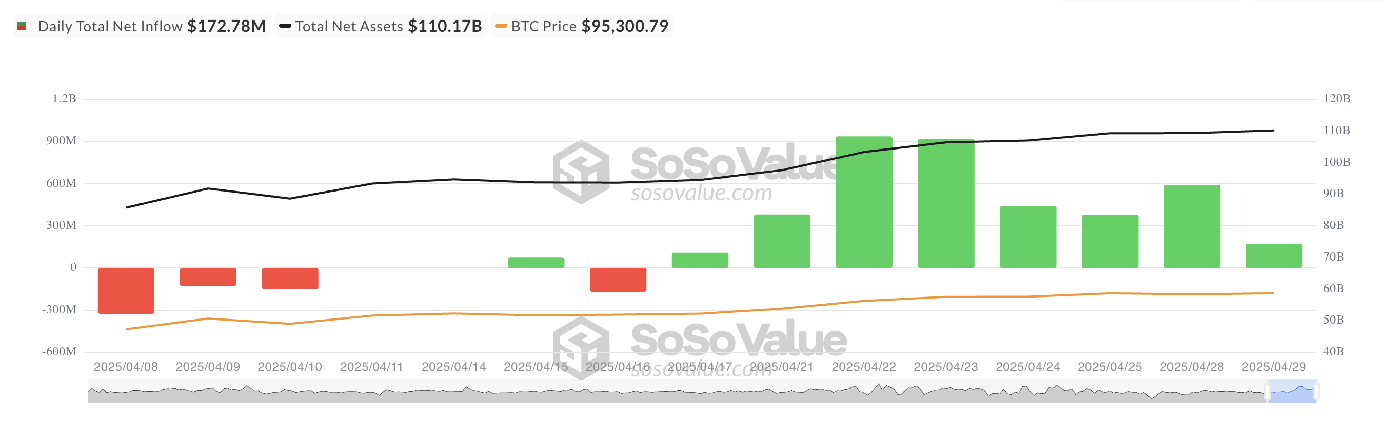 Учора фонди, забезпечені біткоїном, зафіксували ще один чистий притік, що склав 172,78 млн доларів. Це свідчить про стійку довіру до цього класу активів.