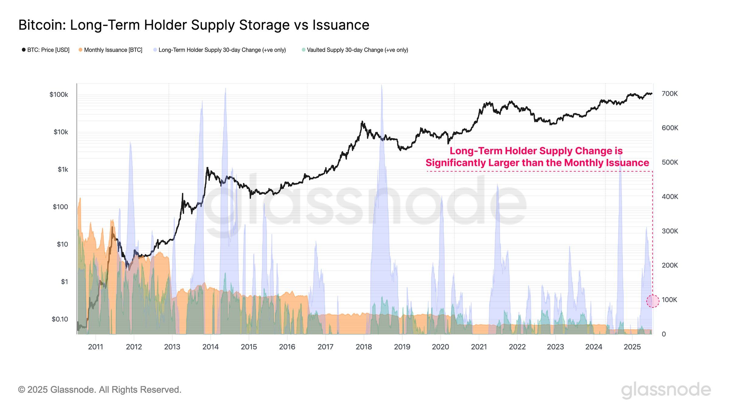 Довгострокові утримувачі (LTHs) також демонструють сильну поведінку накопичення, що додатково сприяє затягуванню пропозиції.