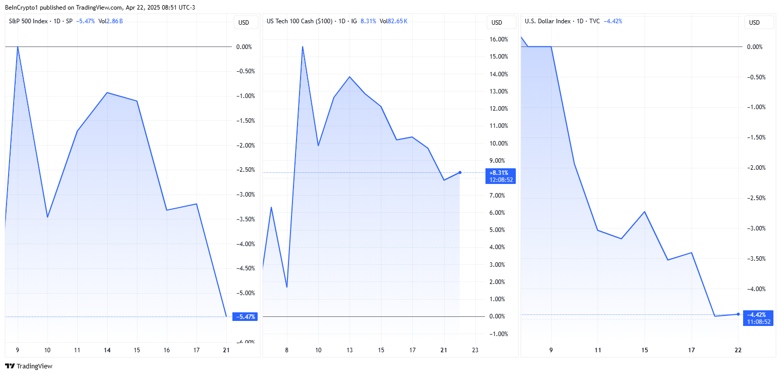 У понеділок S&P 500 та Nasdaq продовжили своє падіння, тоді як індекс долара США (DXY) також впав до 3-річного мінімуму. Це підкреслило розбіжність у показниках між криптовалютами та акціями.
