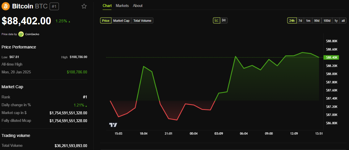Ціна біткоїна наближається до 89 000 доларів, тоді як традиційні ринки знижуються