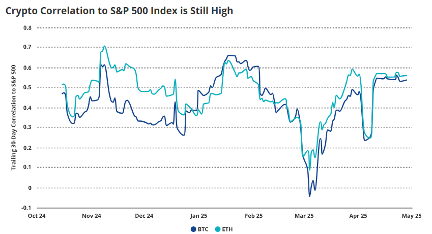 Проте моментум не тривав довго. У міру просування місяця цінова динаміка біткоїна знову синхронізувалася з акціями. VanEck, використовуючи дані Artemis XYZ, зазначив, що 30-денна кореляція BTC-S&P 500 впала нижче 0,25 на початку квітня, але до кінця місяця повернулася до 0,55.