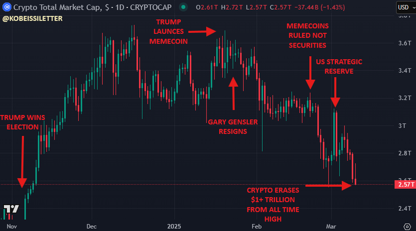 Політичні кроки США посилили тиск на продаж. Нові тарифи президента Трампа на Канаду, Мексику, Китай і потенційно ЄС відлякали інституційних інвесторів від ризикових активів, таких як криптовалюта.